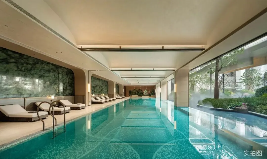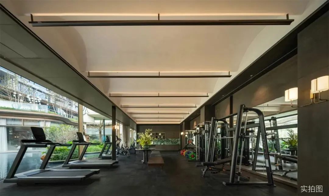 健身区同样是一整面落地窗,在挥汗如雨时,抬眼即见绿意。恒温泳池水面与外界景观水面齐平,呈现无边泳池的视觉感,游弋其间,恍若与自然融为一体。