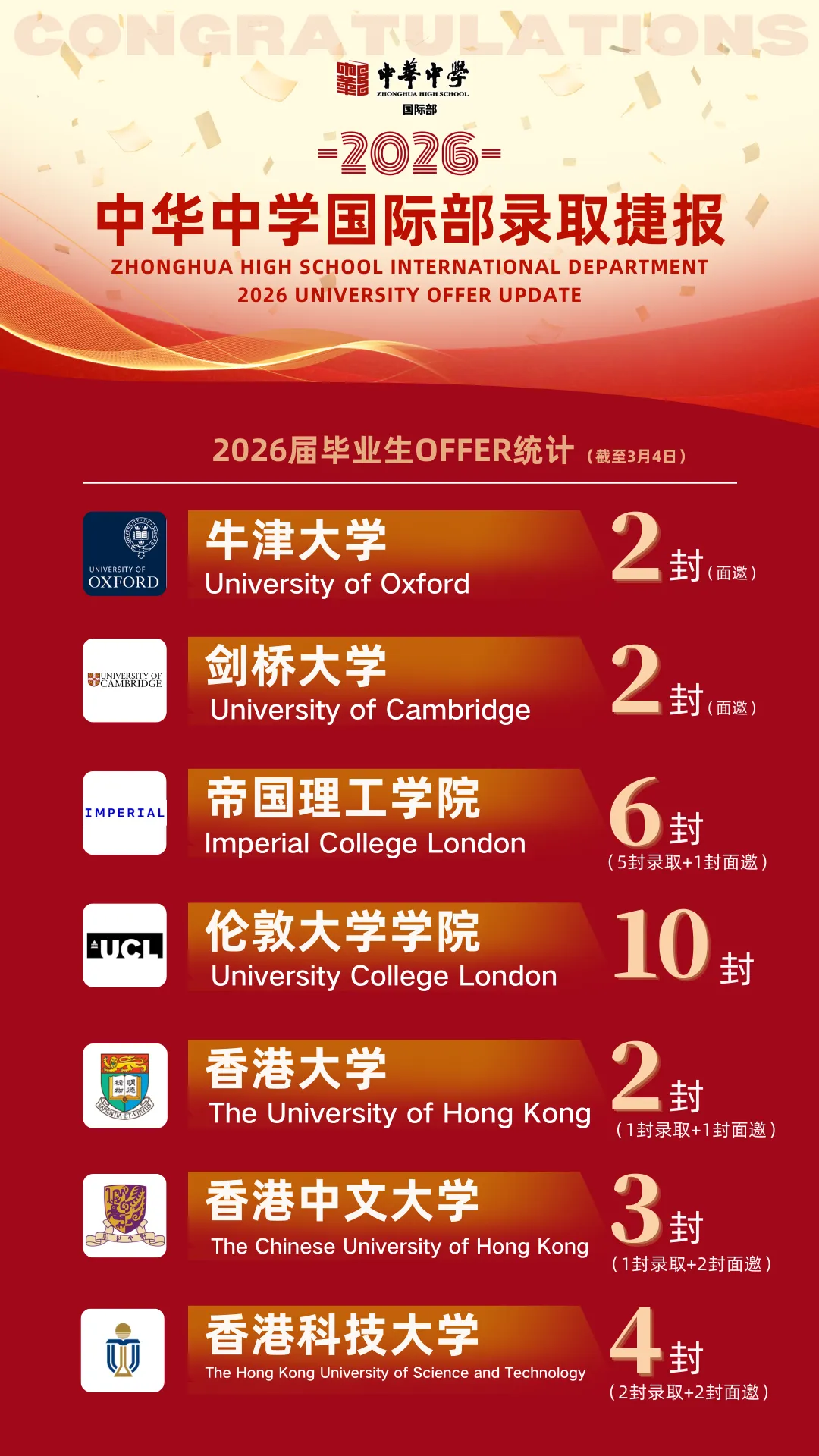 南京中华中学国际部(A-Level),2026届毕业生录取结果如下(截止到2026年3月4日):