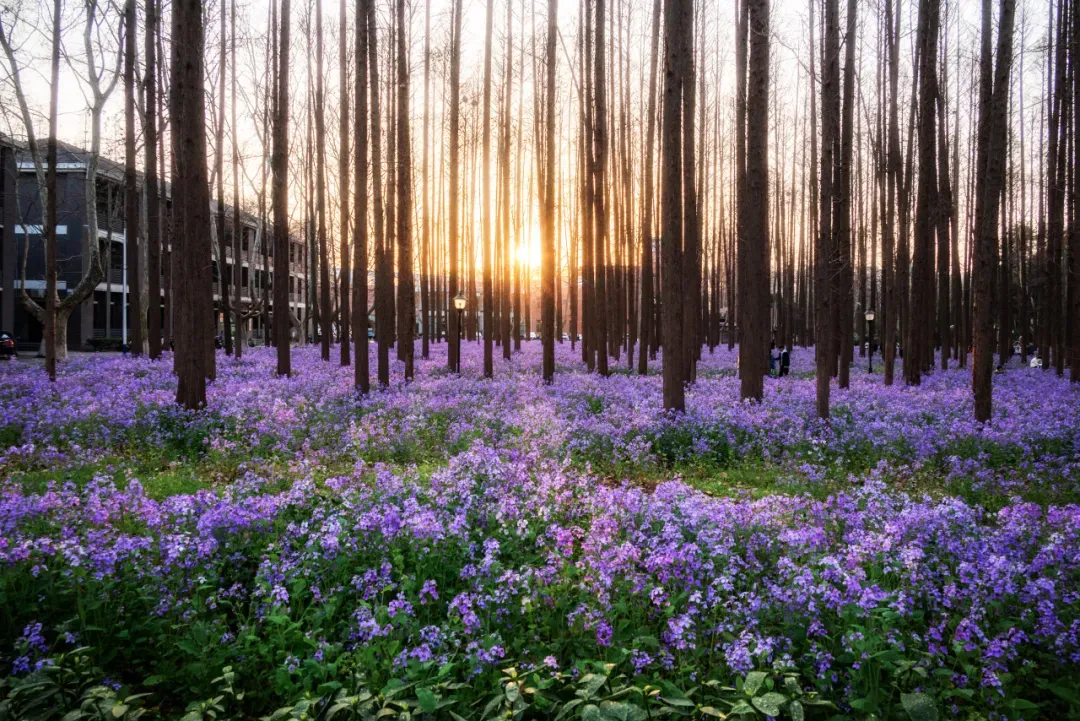 春和景明,紫兰初绽,当暖风拂过南理工挺拔的水杉之下,二月兰悄然铺就一片紫色花海。