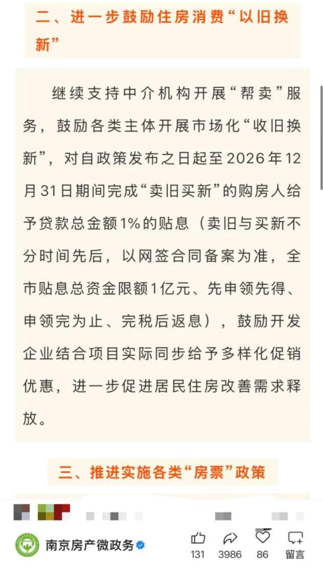 上周,南京出了个政策,大意是说,会给买房人贷款总额1%的贴息,具体见下图:然后我就看到一堆自媒体、中介、销售在那里胡说八道,曲解政策,所以我觉得有必要和大家说一下。大概在去年的时候,博博社发过个文章,说我们会搞贴息,补贴1%的房贷利率,但后来没影了。这次地方上出了个“贴息”,与之前我们理解是不一样的。之前对“贴息”的理解是,直接减少你1%的房贷利率。比如你房贷100万,30年,利率3%,月供4216元。南京的贴息,是指,你贷款了100万,直接给你补1万,相当于贷款变成99万。即,贴息前月供4216元,贴息后4173元,每月少还43元。或者从利率端理解,南京版贴息后,相当于你贷款100万,房贷利率从3%降为2.86%。总之,两种“贴息”是不一样的,我看到最近很多中介销售自媒体在误导大家,有必要站出来给各位澄清下。比如500万的房子,你贷款300万,就给你优惠3万,就这么简单,别想得太复杂。我可以贷款,也可以全款,到底要不要为了补贴去贷款呢?这就是本文最大的意义,也是中介销售自媒体,误导大家的地方。如果你把贴息理解为房贷利率下降1%,可能你不要贷款的,为了白嫖补贴也会去贷款。毕竟你理解的补贴,利率只有2%,和存款差不多,还不如贷款一下了。但实际利率并不是2%,你一边存钱一边贷款还是比较亏的。其实今年来,南京的房产政策还是很给力的,尤其是人才购房补贴政策,有效刺激了新房销售。根据学历不等,可以补贴几万到几十万,对于那种100-200万的房子来说,是实实在在打了6-9折,让人没有办法不去买。那有人就问了,为什么补贴会设计这么多门槛,又要学历又要贷款的,直接对全民补贴不就得了?比如开发商本来要卖100万的(你可以理解为100万才有人会买),因为有了全民1万元的补贴,它就会卖101万,老百姓依然得付100万,讨不得好。但如果补贴有门槛,有人能补,有人不能补,开发商就只能卖100万(卖101的话,会超出没补贴的人预算,房子卖不掉),结局是部分人只要出99万就能买到房子了。目前补的,主要是没有房子的,有贷款,这些经济确实拮据的人,本身也是”善政“的一种体现。我们相信,楼市在这么多强有力的政策下,会一路向上,一路长虹。但各位也得有个清醒的头脑,不要被某些中介销售自媒体给带偏,买了不适合自己的房子。最后,你要买新房的话,除了开发商优惠外,还可以享受如下优惠: