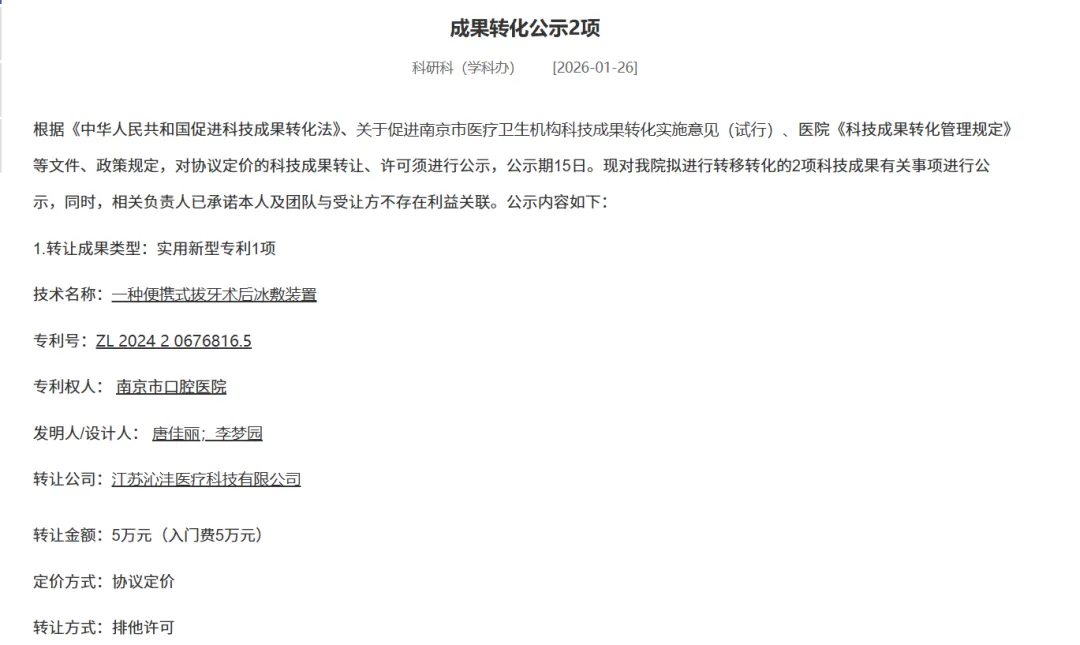 近日,南京市口腔医院发布科技成果转化公示,医院通过排他许可方式,拟将“一种便携式拔牙术后冰敷装置”相关专利转让江苏沁沣医疗科技有限公司,转让金额为5万元。该专利的发明人为唐佳丽和李梦圆。