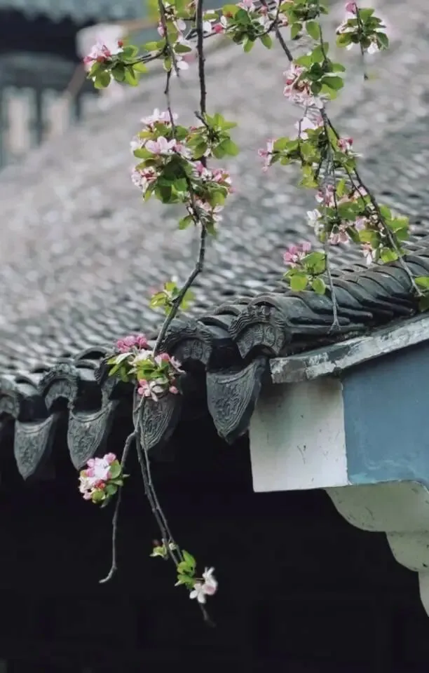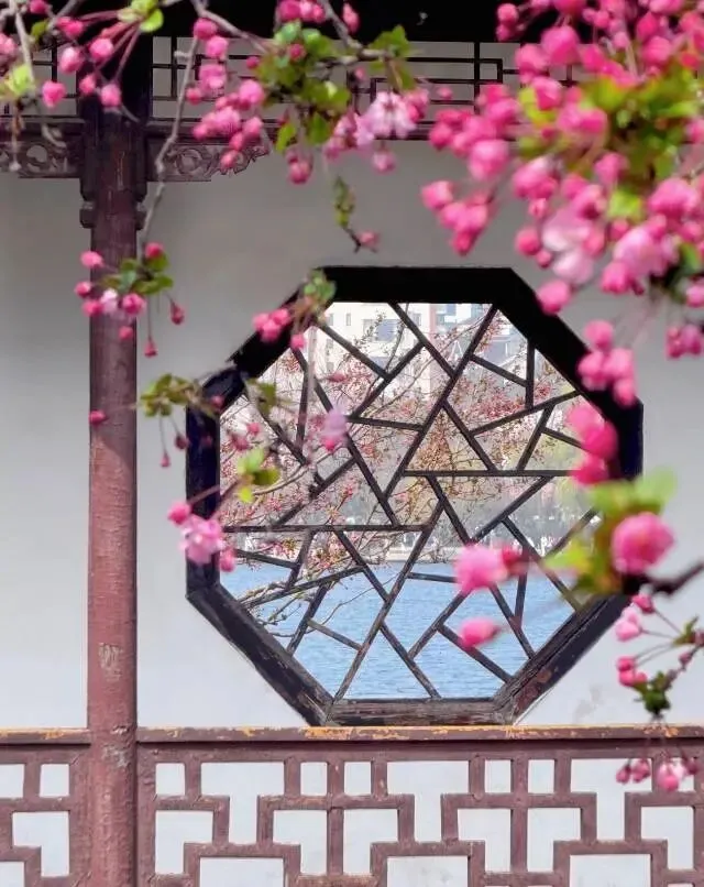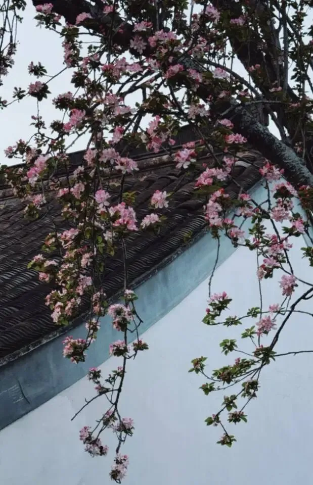 亭台、水榭、曲桥、回廊,全都被海棠温柔包裹。