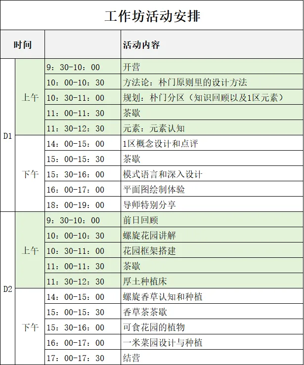 第一天,我们会用最轻松的方式,带大家回顾朴门的基础理念与设计方法,拆解“设计元素”与“设计流程”——你会发现,原来设计不是画图纸,而是像大自然一样思考。