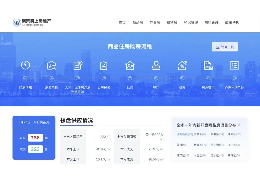 据南京网上房地产官方数据,截止到2026年3月23日,南京商品房认购266套,成交323套。