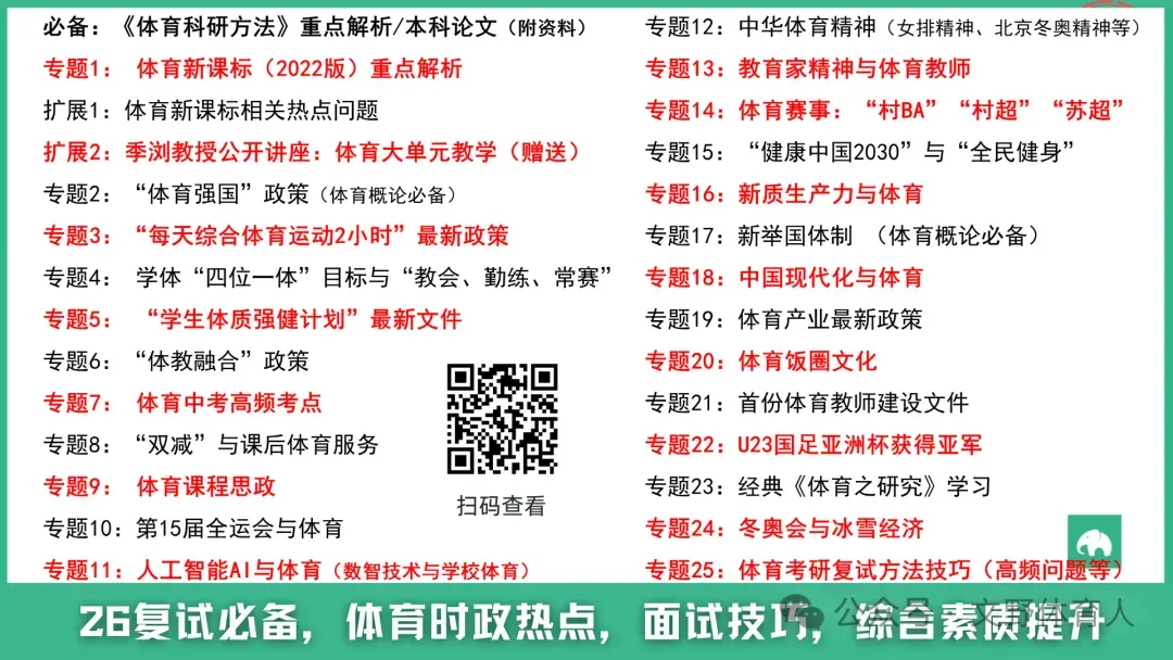 ▲ 26复试面试-体育热点和面试技巧综合课程,适用跨考体育、专业基础薄弱等小伙伴,助力综合素质面试有话可说!已累计助力2000+小伙伴顺利上岸!