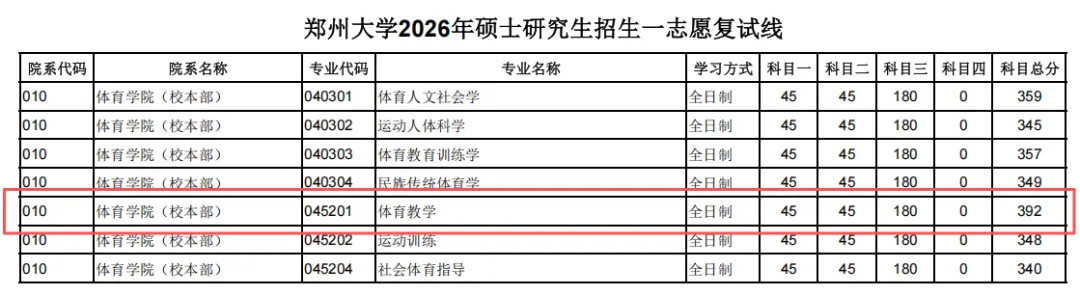 郑州大学2026复试线,体育人文359分,运科345分,体教训357分,民传349分,体教392分,运训348分,社体340分。