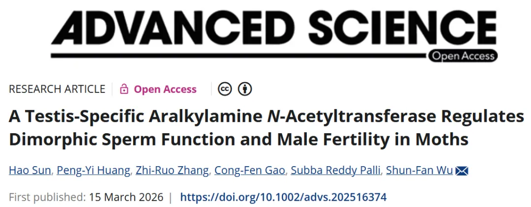 近日,我院吴顺凡教授团队在《Advanced Science》期刊在线发表题为“A Testis-Specific Aralkylamine N-Acetyltransferase Regulates Dimorphic Sperm Function and Male Fertility in Moths”的研究论文。该研究以重大农业害虫草地贪夜蛾为模型,首次揭示了一个鳞翅目保守、精巢特异的芳烷基胺N-乙酰基转移酶基因LTNAT在调控二态精子发育与雄性生育力中的关键作用,为理解昆虫精子二态性的协同调控机制提供了新见解,也为研发基于生殖干扰的新型农药和害虫遗传控制技术提供了潜在分子靶标。