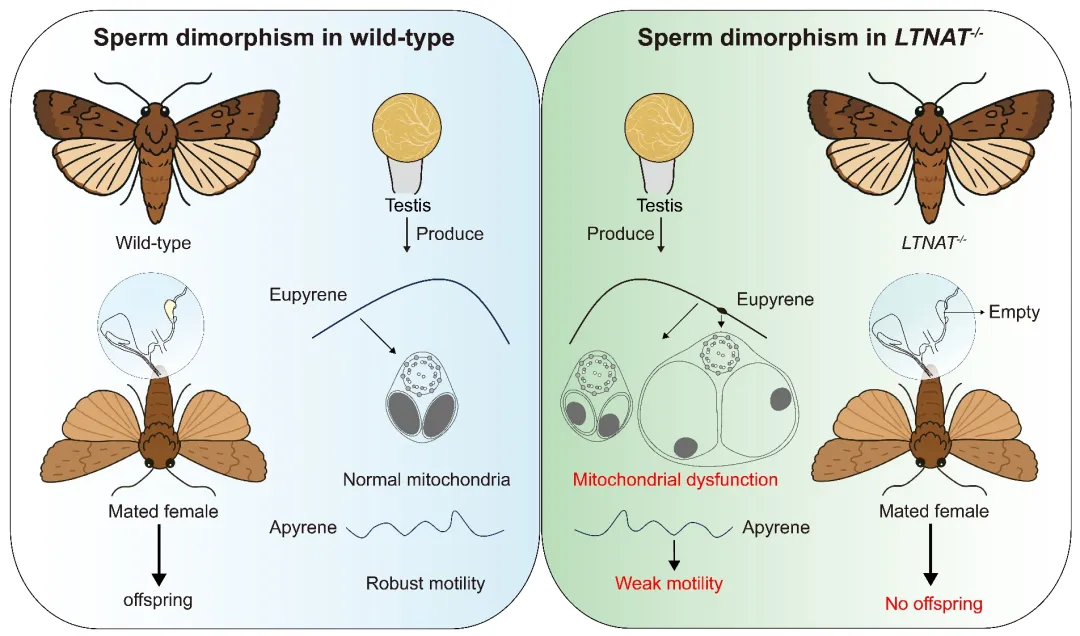 绝大多数鳞翅目昆虫(蛾类与蝶类)雄性个体在生殖过程中同时产生两种形态和功能迥异的精子:一种是有核的“可育精子”,有核精子承担受精功能;另一种则是无核的“辅助精子”,无核精子虽不能受精,却在辅助有核精子于雌性生殖道内迁移、最终抵达受精囊的过程中发挥关键作用。这种精子二态性现象在昆虫生殖生物学中备受关注,但其协同调控机制长期以来尚不清晰。