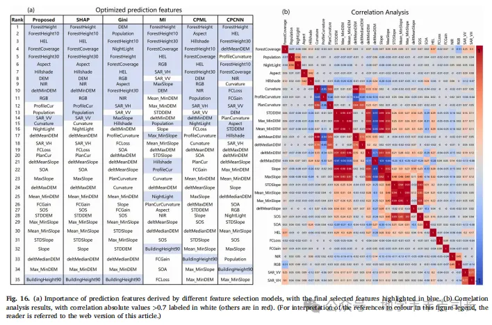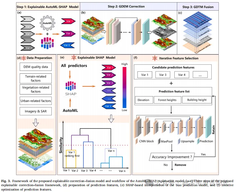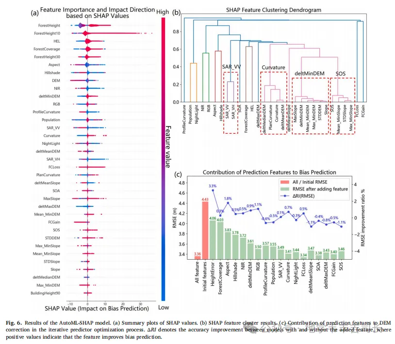 本文通过AutoML-SHAP框架优化了35个多源预测特征,成功识别出15个能够有效捕捉GDEM偏差来源的特征。这一方法不仅提高了特征选择的准确性,还提升了模型的可解释性,使得各个预测特征对模型输出的贡献得以清晰呈现。与传统特征选择方法相比,AutoML-SHAP优化的特征在训练区和非训练区的修正精度均有显著提升,尤其在垂直高程和空间一致性方面。