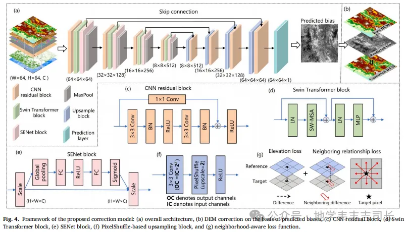 研究提出了一种结合卷积神经网络(CNN)和Transformer模型的混合修正模型,用于提高全球山区裸地地形模型的精度。该模型在全球山地地区的应用展示了显著的修正效果,尤其在处理复杂山地地形时,CNN和Transformer模块的结合大大提高了模型对地形特征的捕捉能力。此外,模型还通过邻域注意力机制进一步提升了相邻像素之间的关系,增强了模型在修正过程中的空间一致性。