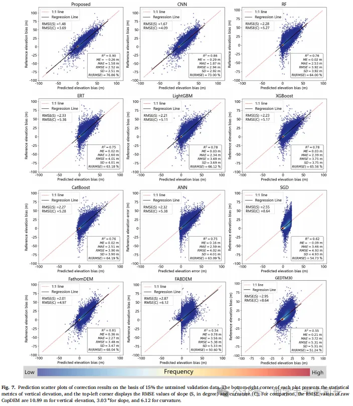 为了克服训练区域以外的修正精度问题,本文提出的GDTM融合模型有效地集成了来自不同源的GDTM修正结果。通过结合ICESat-2等高精度卫星数据,融合模型在多样的验证数据集上展现了更高的修正精度。实验结果表明,融合模型不仅提升了修正精度,还扩大了模型在全球不同山区的适用范围,具有重要的应用价值和广阔的前景。