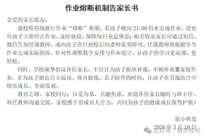 近日,家长群里来自学校发布的“作业熔断机制告家长书”,引发了广泛关注。学校将持续推行作业“熔断”机制,若孩子晚间21:00仍未完成作业,请允许孩子立即停止作业、及时就寝,保障每日充足休息;相关情况家长可通过短信、微信告知任课教师,或由孩子次日到校后向老师说明即可。任课教师将根据学生作业完成实际情况,针对性调整教学安排与作业设计,让孩子的学习更高效、更轻松。同时,学校诚挚倡议各位家长,不盲目为孩子报班补课,不额外布置家庭作业,多为孩子留出自主阅读、体育锻炼、亲子陪伴的时间,让孩子在劳逸结合中快乐成长、全面发展。