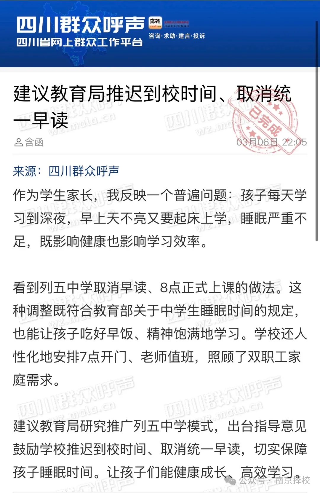 早前,树人有家长在班级群收到通知:期中复习,有班级作业量明显增加。年级部一再要求,严控作业量,确保孩子身心健康。也拜请家长做好配合:超过10:30(或家长认为合适的时间),孩子如果没有完成作业,立即停止学习,孩子休息。后续作业也不用再补,家长信息告知老师即可。实施“作业熔断机制”的初衷是为了保障孩子的身心健康。目前看,对于写作业效率高的孩子没什么影响;对于效率低的孩子,短期可以缓解家庭辅导作业的问题,长期影响还不好说。对于孩子写作业拖拉的问题,家长有时候也很无奈。近日,四川的网友也建议教育家推迟到校时间,取消统一早读,家长表示孩子每天学习到深夜,早上天不亮又要起床上学,睡眠严重不足,建议教育局研究推广列五中学模式,出台指导意见鼓励学校推迟到校时间、取消统一早读,切实保障孩子睡眠时间。让孩子们能健康成长、高效学习。成都市教育局回复:小学上午上课时间不早于8:20,中学上午上课时间不早于8:00,学校不得要求学生提前到校参加统一的教育教学活动。要求学校保障学生必要的午休时间,一般12:00~14:00为学生午餐、午休时间,中午休息间隔原则上不少于1.5小时。严禁占用学生午休时间讲授新课、集体补课、集中答疑、布置作业或组织考试等。三是严控作业总量。小学一二年级不布置书面家庭作业,小学其他年级每天书面作业完成时间平均不超过60分钟,初中每天书面作业完成时间平均不超过90分钟。实行作业“熔断”机制,个别学生努力学习到就寝时间仍未完成作业的,家长应督促按时就寝不熬夜,确保充足睡眠。关于“作业熔断”制,家长对此看法不一: