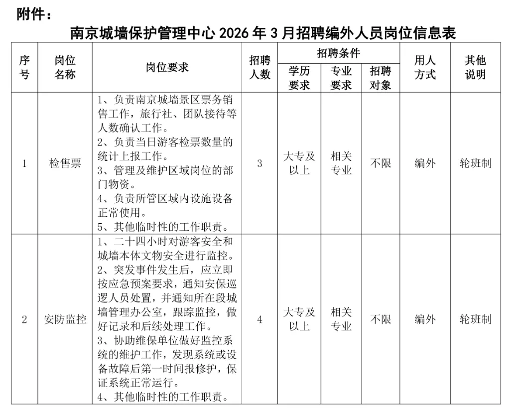 南京城墙保护管理中心2026年度编外员额核定数为112人,现有在岗人数105人。现本次拟招聘编外人员7人,具体岗位、数量、资格条件等相关信息详见《南京城墙保护管理中心2026年3月招聘编外人员岗位信息表》。