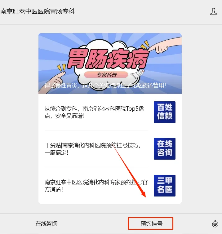 微信搜索“南京肛泰中医医院胃肠专科”公众号并关注,如下图所示: