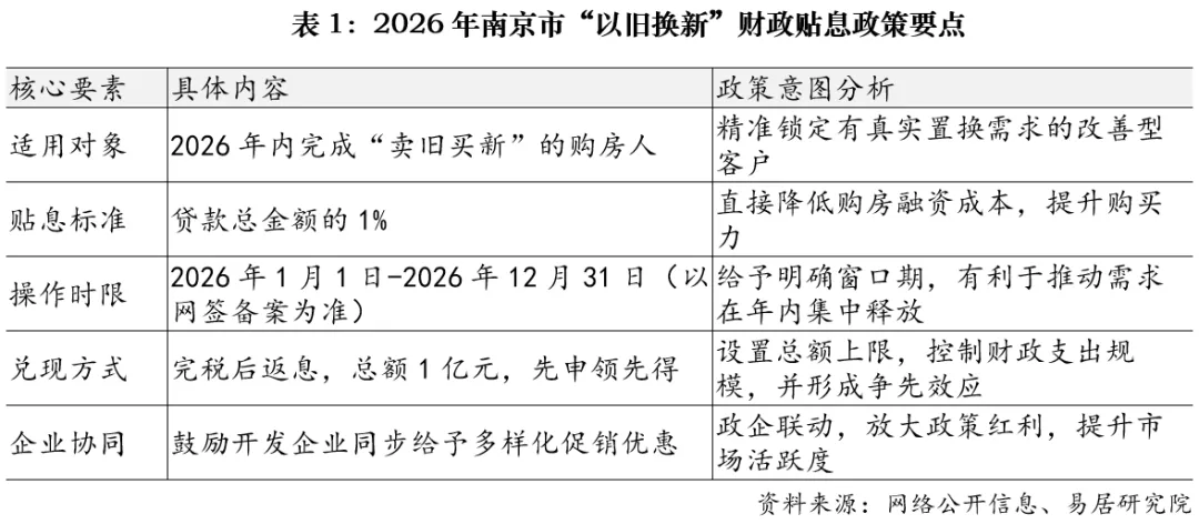 亮点梳理如下:1)土地供应精准化:面向青年人、养老人群、产城融合人群及都市圈聚集人群等四类特定群体,供应在区位、规模、容积率及配套上均适配的差异化地块,为房企打造适销对路的“好房子”提供了基础条件。2)品质管控体系化:通过修订完善住宅品质提升设计指引,并强化施工监督,将改善型住宅的设计与建造导则落到实处,推动行业从“规模型”向“品质型”转型。总体来看,此次南京政策的核心,就是围绕“人房地钱”中“人”与“地”两个关键要素,持续促进各类资源的有效对接。针对改善性住房需求的核心堵点——“卖旧难”,政策继续深化“以旧换新”模式,并创新引入财政贴息工具,形成“政府贴息、中介帮卖、企业让利”的多方合力。我们认为此举将发挥较好的政策效果,尤其是在降低置换成本方面:对2026年内完成“卖旧买新”的购房人给予贷款总额1%的贴息,全市贴息总额达1亿元。该措施直接降低了购房人的资金成本,同时“卖旧与买新不分先后”的设定也增加了操作灵活性,有助于打通一、二手房置换链条。此外,政策还将放大乘数效应:鼓励开发企业同步给予促销优惠,预计将与财政贴息形成合力,有效激发改善性需求的释放。