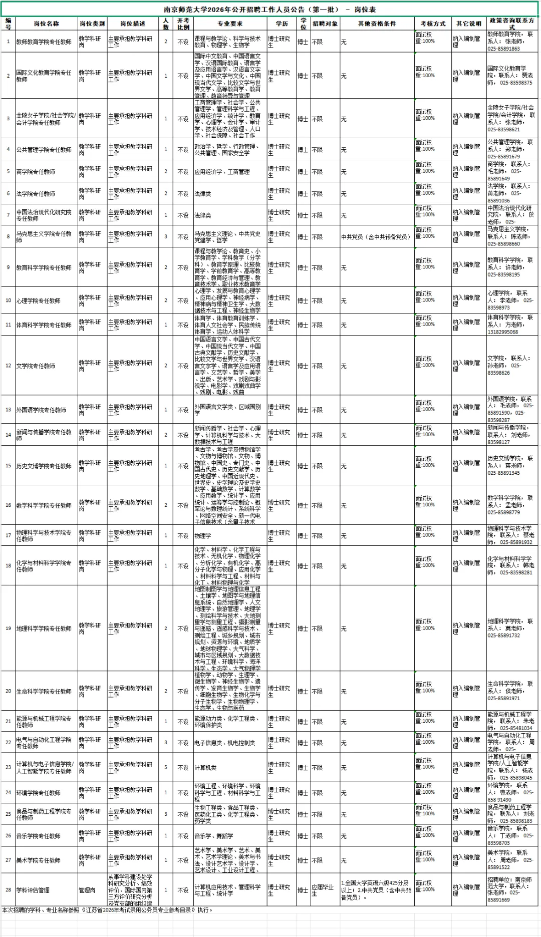 咨询电话:岗位1-27:025-85891809(招聘政策)、025-85891669(入职手续办理),联系人:薛老师、张老师;