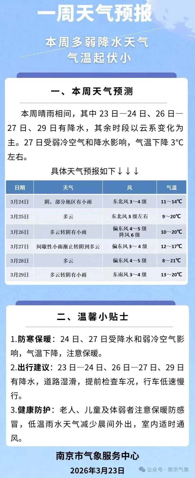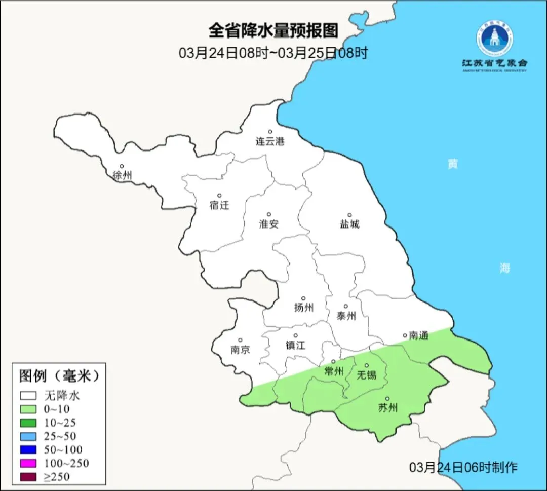 3月24日08时至3月25日08时,苏南地区阴有时有小雨并渐止转多云,其他地区多云。今天最高温度:淮北地区16~17℃,其他地区14~15℃;明晨最低温度:本省东北部地区4℃左右,苏南地区7~8℃,其他地区6℃左右。全省偏东风3—4级。