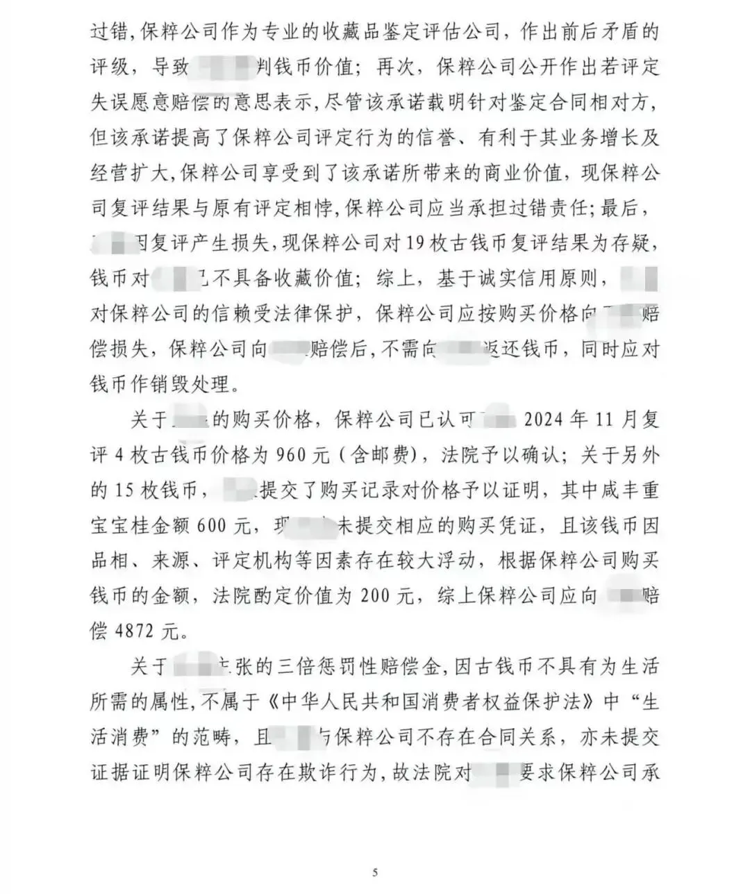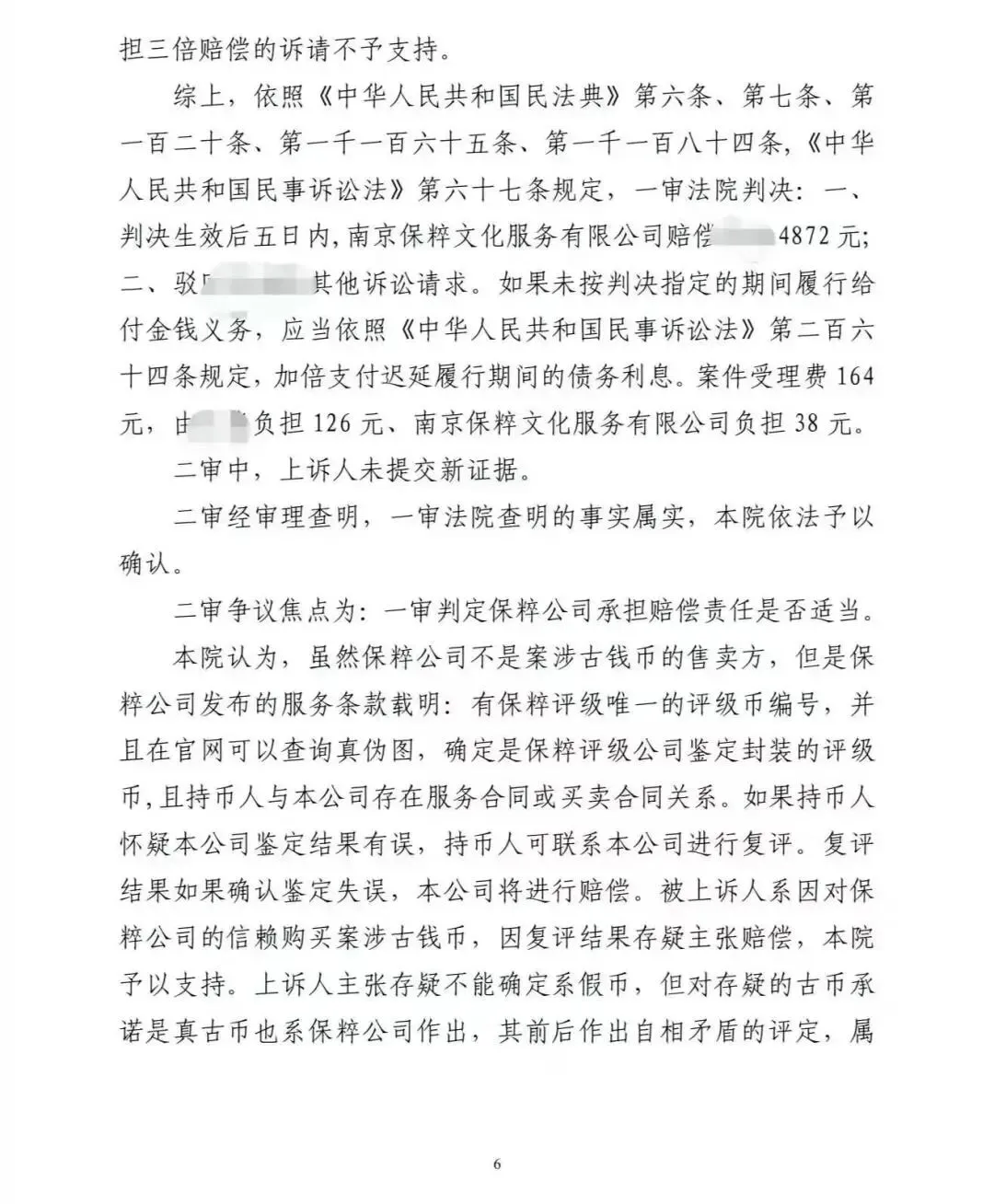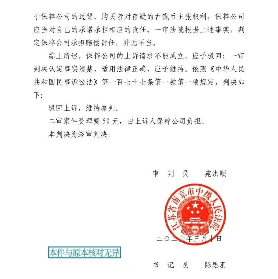从整个二审判决来看,维持一审的判决,现有证据不能判定南京保粹钱币评级公司存在欺诈行为,3倍赔偿没有了,只支持原价赔偿。