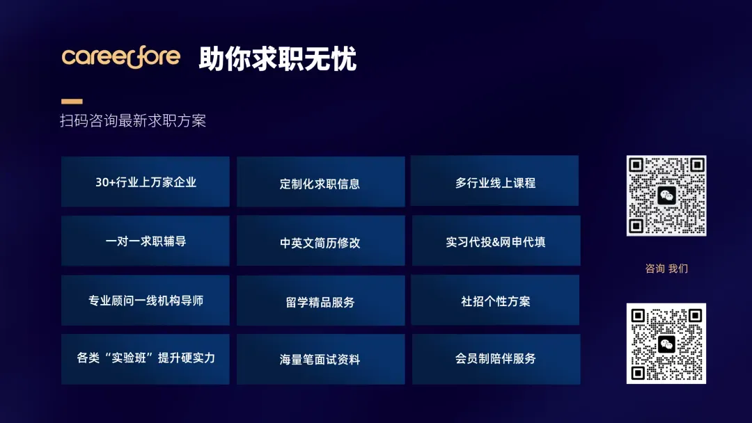Careerfore®致力于为在校大学生及职场新人(入职1-3年)提供优质的求职咨询和职业教育解决方案,深耕职前教育领域至今已逾九载。我们已为数千名学员提供规划咨询、职前教育培训、职位申请咨询、本硕等多阶段求职指导、境外留学咨询等服务。