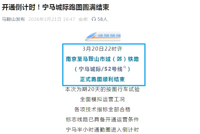 刚刚,马鞍山官网宣布,宁马成绩跑图,圆满结束。这个官宣的时间,比南京日报早了一点。这就是马鞍山的速度!跑图结束,意味着距离开通时间已经到了倒计时的阶段,如果一切顺利的话,最早3月底就有可能开通。当然,稳妥起见,这条线路放在4月份开通更加从容。但无论是3月份还是4月份已经不重要了,反正1个月内,这条线路就要通了!现在,各大地铁站已经万事俱备,只欠东风,基础设施全部OK了。马鞍山滚动播放地铁站修建进度,全民监工,进展神速。一期工程全长54千米,其中南京段26.51千米,于2021年12月开工;马鞍山段27.49千米,于2021年3月正式开工。宁马城际铁路(一期)共设站16座,其中南京段8座、马鞍山段8座。宁马城际地铁的开通,对于南京以及都市圈城市来说,是一个重大利好,堪称改变了都市圈城市发展的格局,意义重大!说这条地铁为超级重磅地铁,根本没有任何夸张成分。我们来看一下它的价值:作为南京都市圈最忠心的核心城市,马鞍山很想融入南京,但确实也没有索取到什么。宁马城际一通,马鞍山就正式成为拥有地铁的城市了。要知道,目前全国拥有地铁的城市仅有43个(算上有轨54)。马鞍山马上就要成为第44个了,这一点即便很多江苏城市也做不到。我有地铁,你没地铁;我有机场,你没机场...很多事情一句话直接KO,你还不好反驳。从这一点就明显可以看出,这条地铁对于马鞍山的城市地位拉升,还是很有帮助的。这也是马鞍山举全市之力修建这条地铁的重要原因。宁马城际一通,南京成为全国唯一地跨两省且外联多个城市的都市圈中心。上海昆山虽然也跨省了,但只有1条。南京与句容、与马鞍山联通,马上还与滁州联通。当然,如果扬州愿意的话,还会与扬州联通。这种放射状地铁辐射能力,全国遥遥领先。宁马城际的开通,是南京对马鞍山的一个重大承诺,它向外透露了一个重大信号:跟着南京混,是可以得到实打实的好处的。本来S2这条线路在南京的优先级不高,但21年开始突然加速,突然建设,突然上马。如果不是宁马一体化的大格局,南京可能不会这么早投入这条线路。毕竟江北十年来都还没有开通新线路,结果马鞍山领先了。板桥的居民,一直想要地铁,而且因为这个事维权了很多次,但上面不为所动。这张爆浆的图片,已经说明一切。现在板桥有3个站点,地铁的问题迎刃而解,板块的配套有了一个重大提升。当然,现在已经不是当年,地铁通了,房价不一定就涨。很多板块的地铁通了,房价反而跌了。地铁对于房价的拉动作用,已经没那么大了。但房价高低,更多的是看周期,配套仅仅是一个助力。如果没有地铁,房价有可能降得更多。所以这事无需内耗。板桥地铁的推进,确实和马鞍山有很大关系,否则它的建设时序不可能放这么早。考虑到现在板块的房价,也算是宜居宜业了!现在,位于宁马城际地铁口的石林云城,最近卖爆了!一不小心成了全市第一,有小阳春的因素,有人才补贴的因素,但我认为跟宁马城际的马上开通,也有一定关系。项目位于宁马城际雨花经济开发区站旁边,出门就是地铁。在众多户型产品中,建面约109㎡的三室两厅两卫格局,14#滨河洋房即将应势加推,其中这一爆款109㎡产品将应市补货上新。区域还有89户型、136户型等。现在卖的位于14号楼,旁边就是板桥河,河两岸是公园,环境还是可以的,不靠高架,不靠大路,比较安静。