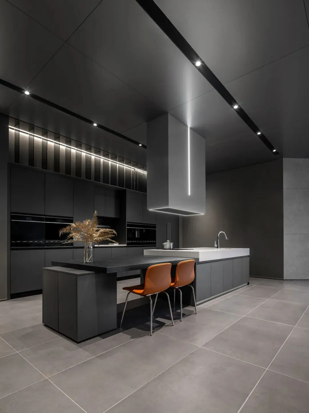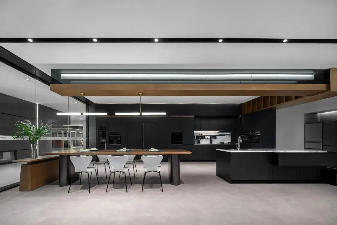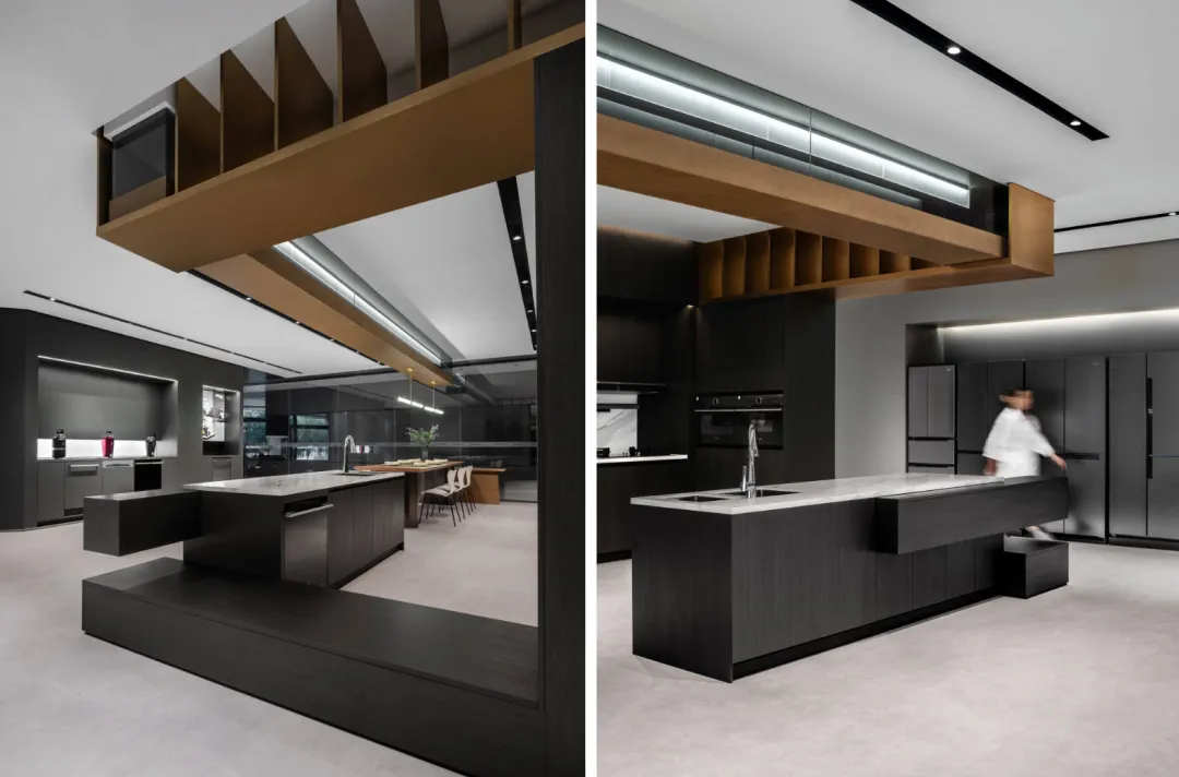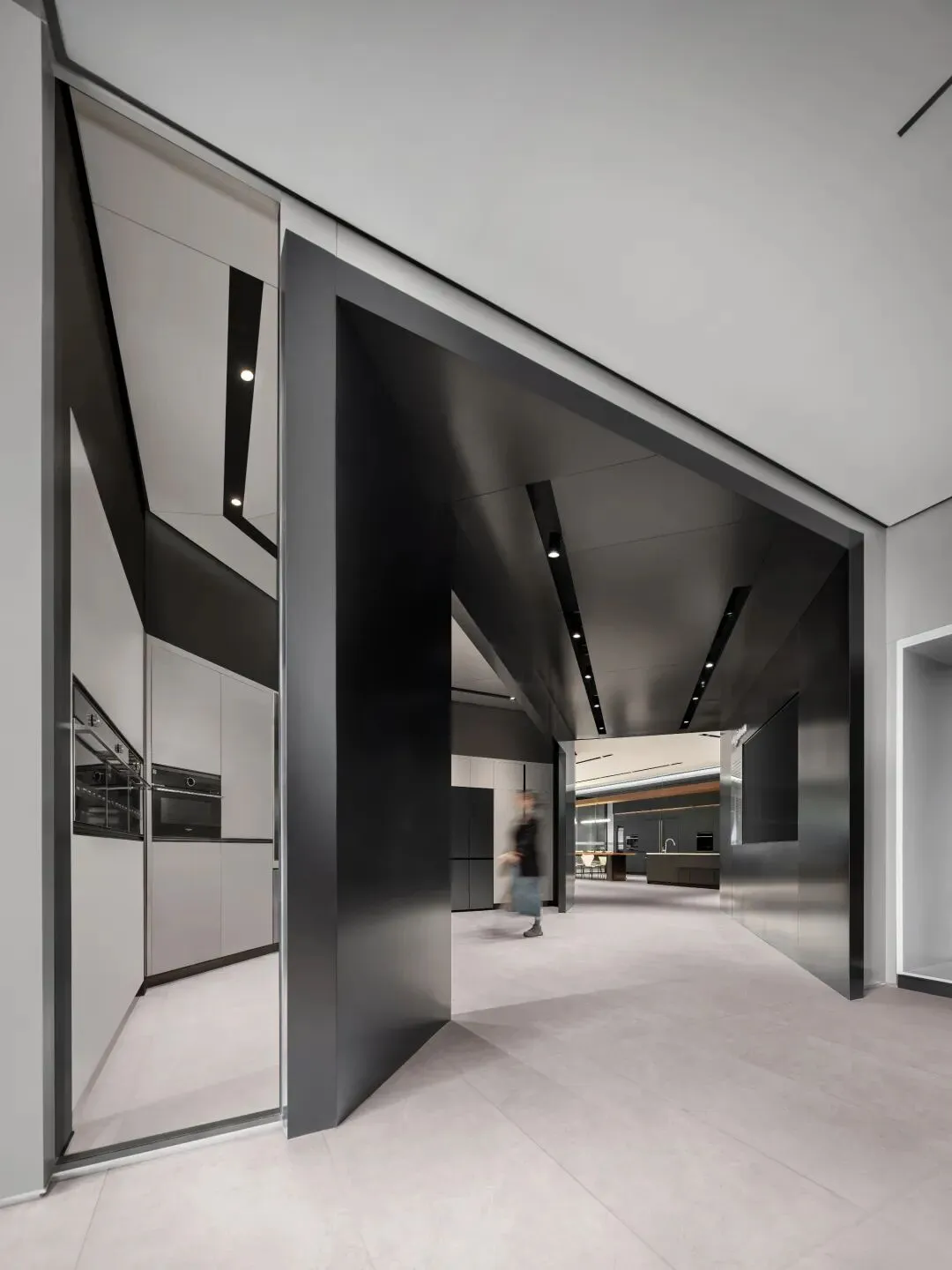 展厅设计厨电区域以极简主义为基调,冷静的黑、白、灰勾勒出色彩基调,金属和玻璃则点亮了空间的质感。