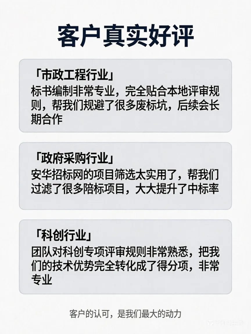 深耕招投标行业 17 年的专业服务团队,专为南京企业打造「精准商机筛选 + 定制化标书代写」一站式全流程服务,从源头解决投标核心痛点,助力企业优化投标方案,降低废标风险。