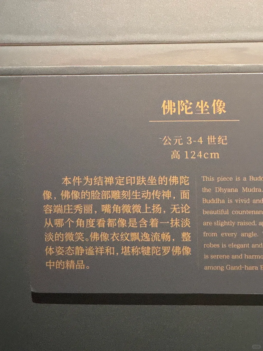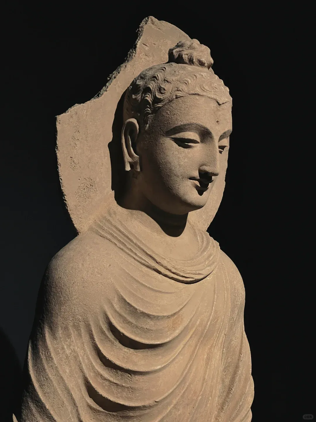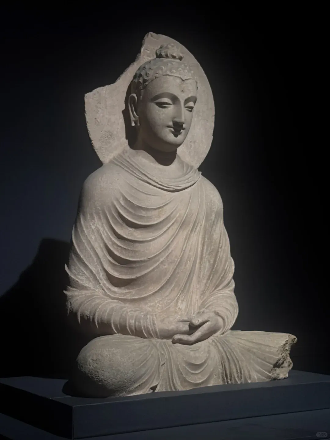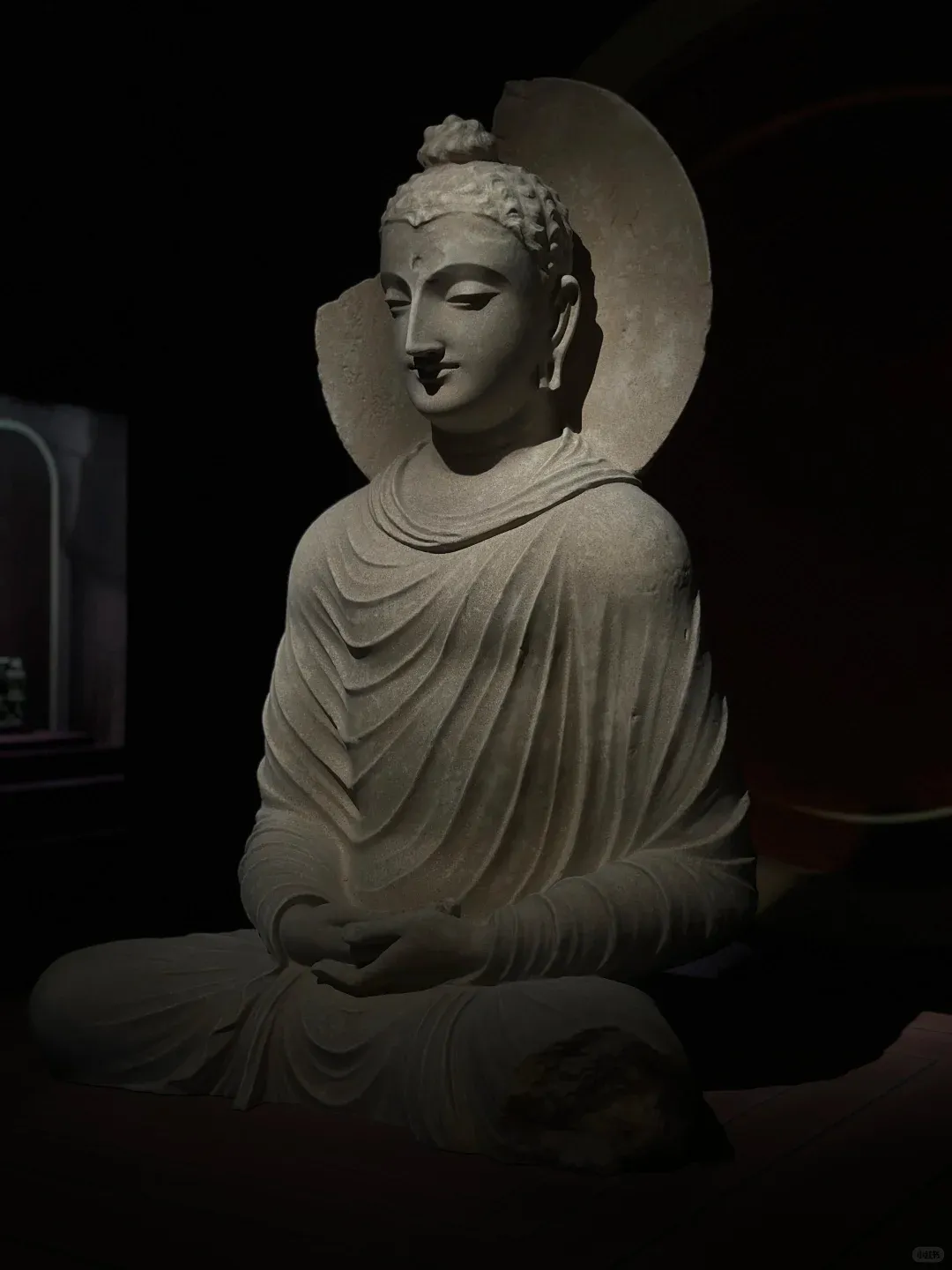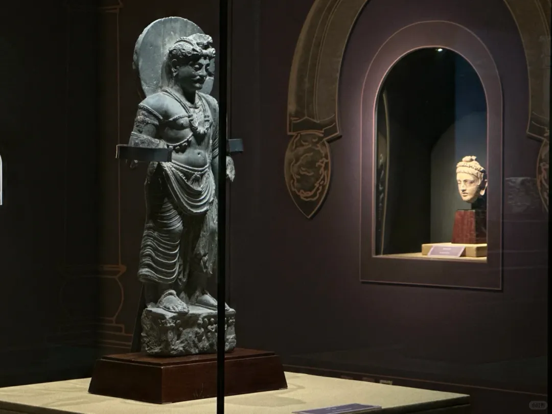 想要找到这份宁静,其实很简单:避开大报恩寺主展区的人流,循着若有若无的檀香,拐进那间不足30㎡的独立展厅,全世界的喧嚣都被挡在门外。没有层层玻璃罩的阻隔,没有嘈杂的讲解喇叭,1.24米的犍陀罗佛陀坐像就安坐在眼前,聚光灯温柔裹着佛像,空灵梵乐萦绕耳畔,连呼吸都忍不住放慢。这里没有嘈杂的解说,没有拥挤的人群,时间仿佛被按下了慢放键。更难得的是,没有玻璃罩的阻隔,一尊高达1.24米的犍陀罗佛陀坐像,就这样静静伫立在展厅中央,与你直面相望。聚光灯温柔洒落,耳畔萦绕着空灵梵乐,鼻尖萦绕着清雅檀香。他垂眸颔首,嘴角噙着一抹浅淡却治愈的笑意,这就是被世人誉为“佛的第一抹微笑”。穿越1900多年的漫长岁月,从古印度的文明熔炉中跋山涉水而来,静静伫立在南京这片土地上,不语,却胜千言。