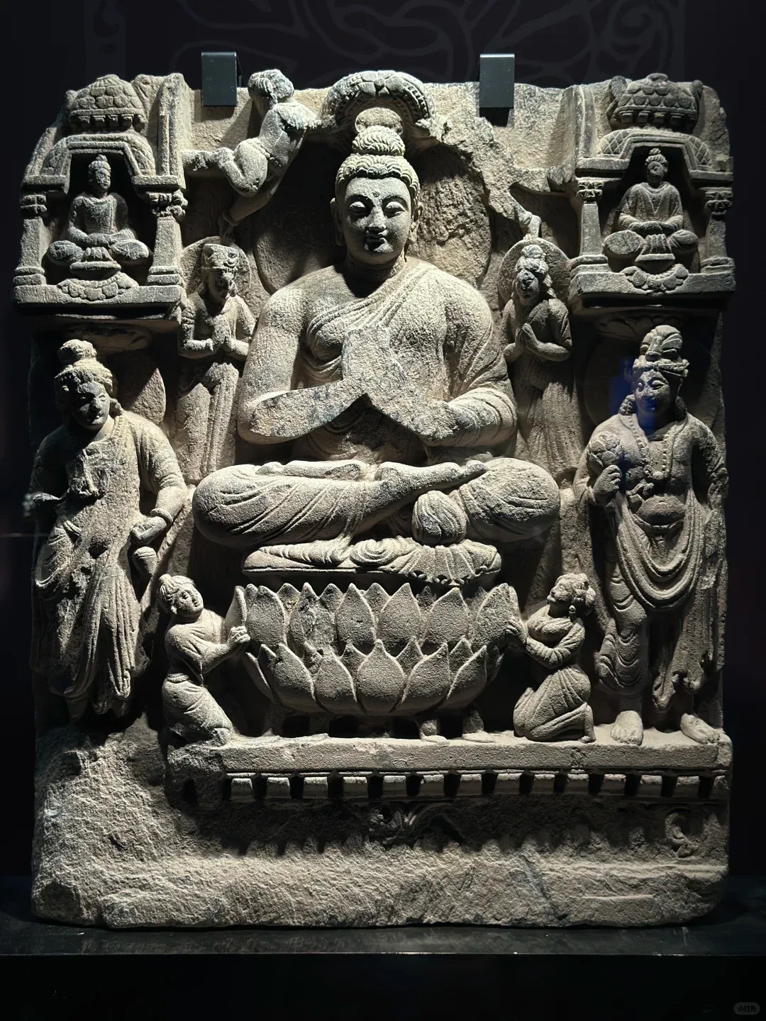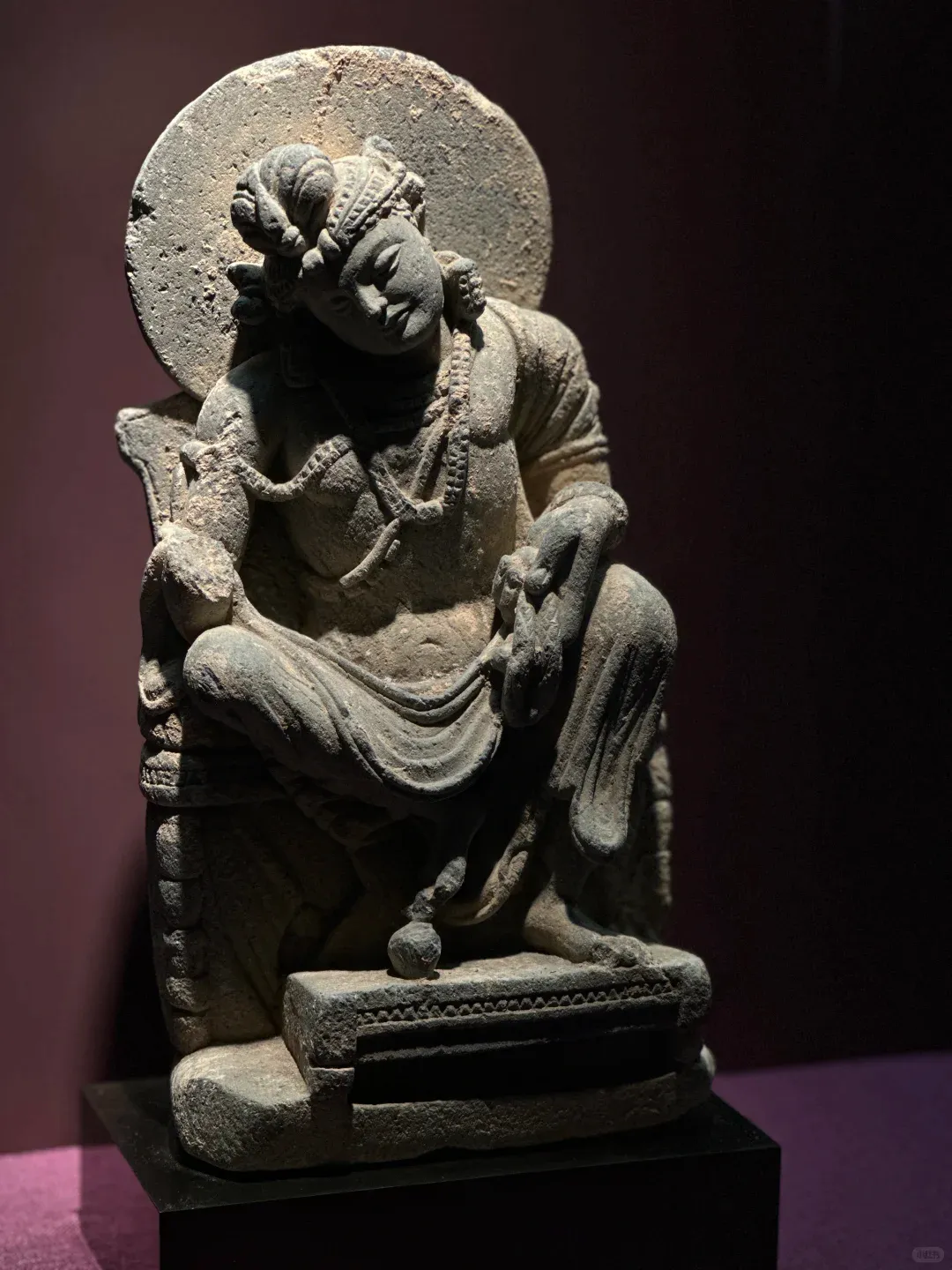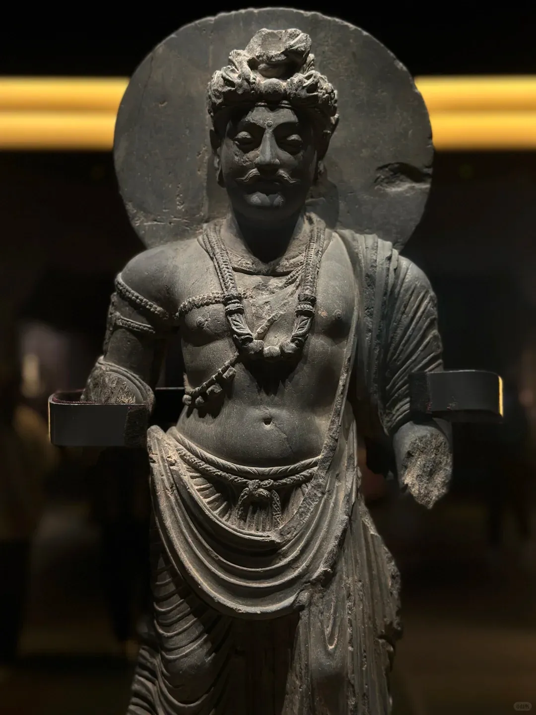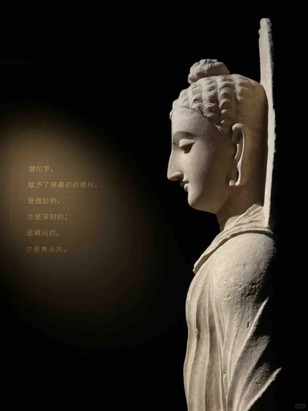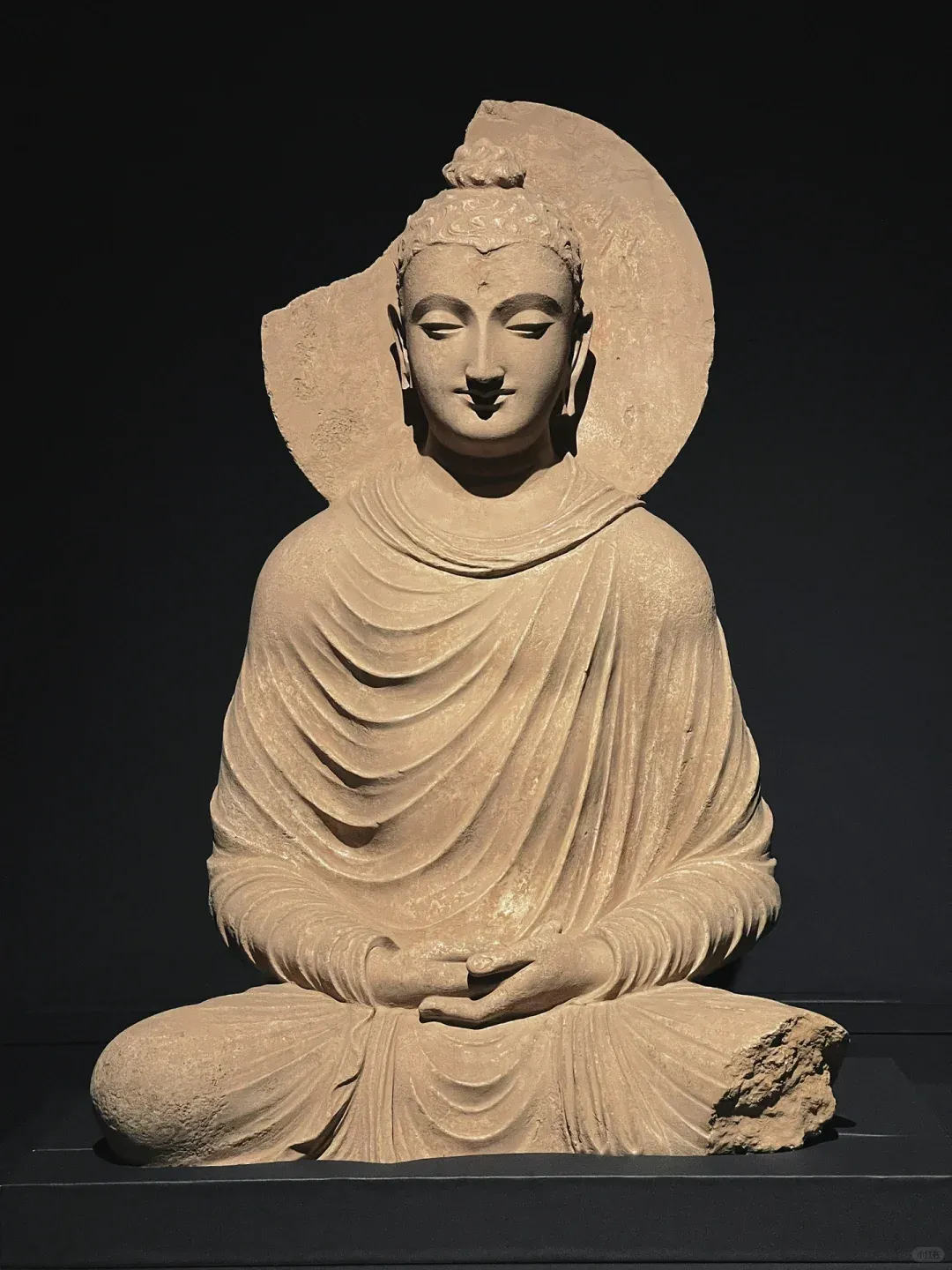 想要找到这份宁静,其实很简单:避开大报恩寺主展区的人流,循着若有若无的檀香,拐进那间不足30㎡的独立展厅,全世界的喧嚣都被挡在门外。没有层层玻璃罩的阻隔,没有嘈杂的讲解喇叭,1.24米的犍陀罗佛陀坐像就安坐在眼前,聚光灯温柔裹着佛像,空灵梵乐萦绕耳畔,连呼吸都忍不住放慢。这里没有嘈杂的解说,没有拥挤的人群,时间仿佛被按下了慢放键。更难得的是,没有玻璃罩的阻隔,一尊高达1.24米的犍陀罗佛陀坐像,就这样静静伫立在展厅中央,与你直面相望。聚光灯温柔洒落,耳畔萦绕着空灵梵乐,鼻尖萦绕着清雅檀香。他垂眸颔首,嘴角噙着一抹浅淡却治愈的笑意,这就是被世人誉为“佛的第一抹微笑”。穿越1900多年的漫长岁月,从古印度的文明熔炉中跋山涉水而来,静静伫立在南京这片土地上,不语,却胜千言。