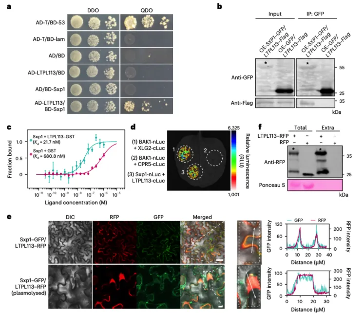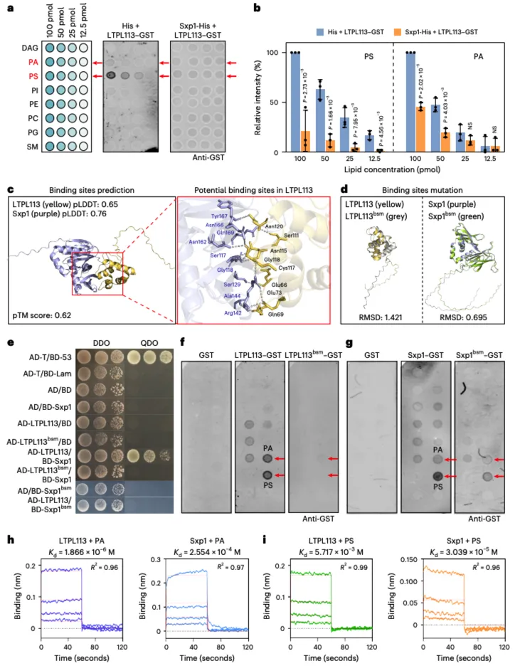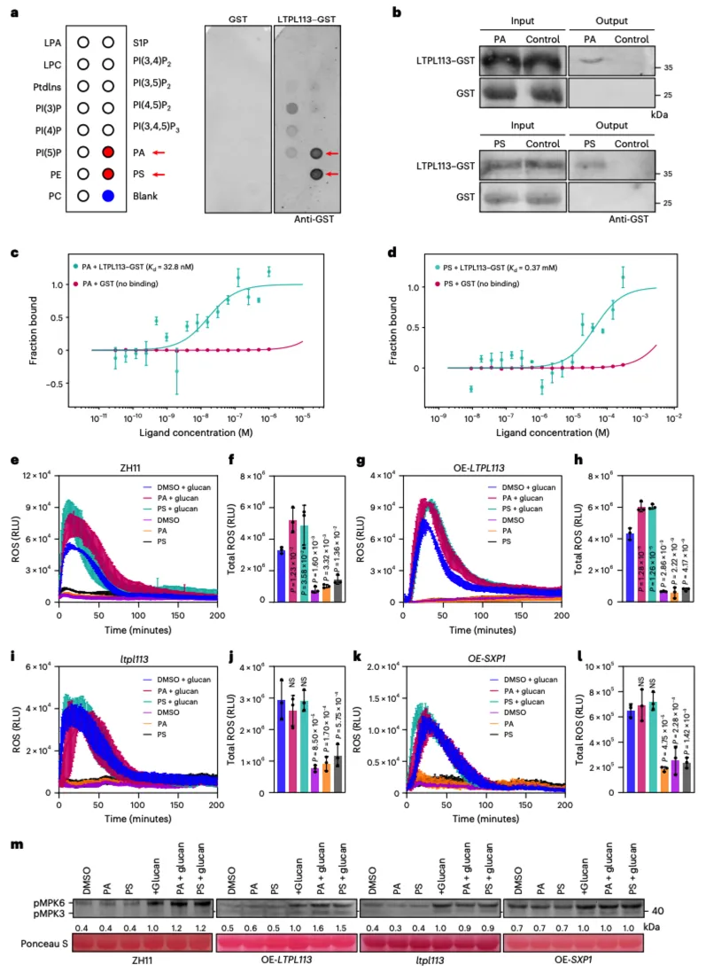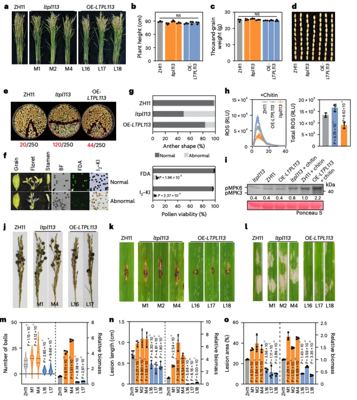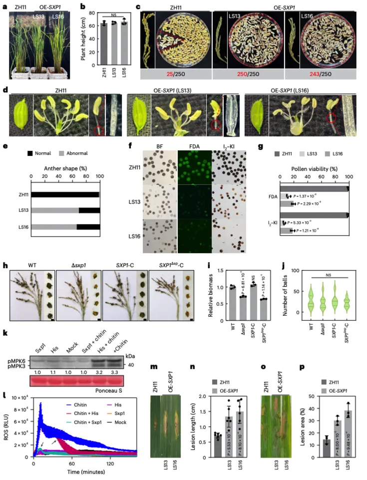 稻曲病菌(Ustilaginoidea virens)病是全球水稻产区日益严重的真菌病害,不仅造成严重的产量损失,其产生的真菌毒素还威胁粮食安全。稻曲病菌采取一种独特的花器官特异性侵染策略:它定殖于颖花内部,通过干扰受精过程导致不育,最终形成俗称“稻曲”的菌球。尽管已知稻曲病菌在侵染早期就能诱导水稻灌浆基因表达以获取营养,但其如何从机制上同时破坏水稻受精并抑制寄主免疫,这一直是该领域悬而未决的“认知缺口”。2026年3月23日,南京农业大学植物保护学院张正光教授与张海峰教授团队在国际顶尖植物学期刊 《Nature Plants》 上在线发表了题为“Rice false smut fungus hijacks rice lipid signalling to manipulate floret development and immunity”的研究论文,首次鉴定到稻曲病菌(Ustilaginoidea virens)分泌的一种关键效应蛋白 Sxp1,揭示了其通过靶向水稻质外体脂质转运蛋白 LTPL113,干扰磷脂酸(PA)和磷脂酰丝氨酸(PS)介导的脂质信号通路,从而精准调控水稻颖花发育并抑制植物免疫的分子机制。这一发现不仅阐明了花部病原真菌如何利用生殖组织获取营养,还为解决水稻抗病性与产量平衡的“生长-防御权衡”难题提供了重要的理论指导。研究团队首先通过室内表型分析验证稻曲病菌侵染对水稻育性的影响,对比健康稻穗与染病稻穗发现,染病稻穗空秕率高达80.1%,远高于健康稻穗的30.4%;通过时间梯度观察病菌侵染过程,发现侵染初期菌丝缠绕花丝,后期逐步包裹花药与整个花器官,且随着侵染进程推进,花粉活力持续下降,侵染后期花粉几乎完全皱缩失活。基于该结果提出假说:稻曲病菌在侵染早期通过降低花粉活力阻止水稻受精,从而获取持续营养完成定殖。为筛选稻曲病菌关键效应子,研究团队对营养限制、营养丰富及体内侵染三种条件下的病菌分泌组进行质谱分析,结合主成分分析、火山图与韦恩图筛选候选效应子,最终锁定9个侵染早期高表达的效应子;通过本氏烟瞬时表达与辣椒疫霉(P. capsici)侵染实验,鉴定出Uv_4853(命名为Sxp1)可显著增强病原菌侵染,且其分泌型信号肽是发挥免疫抑制功能的关键;酵母转化酶分泌实验、亚细胞定位检测证实Sxp1为胞外分泌蛋白,侵染水稻花器官后定殖于质外体。分泌组筛选鉴定Sxp1为稻曲病菌关键胞外免疫抑制效应子构建Sxp1过表达水稻株系(OE-SXP1),表型鉴定显示过表达株系株高无显著变化,但空秕率超97%,花丝粘连、花粉活力大幅降低;构建Sxp1敲除突变体Δsxp1与回补株系,发现Δsxp1菌株致病力显著减弱,稻穗上病菌生物量与稻曲球数量减少,且对水稻花粉活力的损伤大幅缓解;分子水平检测表明,Sxp1可抑制几丁质诱导的MAPK激活与ROS活性氧爆发,过表达Sxp1的水稻对稻瘟菌、纹枯菌敏感性提升,抗病相关基因表达量下调。利用酵母双杂交文库筛选,鉴定出水稻脂质转运蛋白LTPL113为Sxp1互作蛋白,进一步通过酵母双杂交、免疫共沉淀、微量热泳动(MST)与荧光素酶互补实验,证实Sxp1与LTPL113存在特异性相互作用;亚细胞定位与蛋白免疫印迹检测显示,LTPL113同样定殖于胞外区域,与Sxp1共定位,明确二者在水稻质外体发生互作。通过CRISPR-Cas9构建LTPL113敲除株系(ltpl113)与过表达株系(OE-LTPL113),表型分析显示两类株系株高、千粒重无明显差异,但敲除株系空秕率达48%,花药畸形、花粉活力显著降低,过表达株系育性缺陷相对轻微;免疫检测发现,过表达株系几丁质诱导的活性氧积累与MAPK激活水平升高,对稻曲病菌、稻瘟菌、纹枯菌抗性增强,敲除株系则表现为免疫缺陷、抗病性大幅下降。脂质结合实验表明,LTPL113可特异性高亲和力结合磷脂酸(PA)与磷脂酰丝氨酸(PS),对其他磷脂结合力较弱;功能验证发现,PA、PS单独无法诱导活性氧爆发,但可增强葡聚糖诱导的免疫应答,该增强效应依赖LTPL113;外源施加PA、PS可提升水稻对稻曲病菌的抗性,脂质组学检测显示,ltpl113花器官中PA含量显著降低,Δsxp1侵染的水稻花器官中PA、PS含量高于野生型菌株侵染组。这些数据表明LTPL113通过与脂质结合来促进PAMP触发的免疫反应,从而增强水稻的免疫力;而Sxp1可能拮抗这种脂质介导的防御途径。利用扫描电镜观察花粉结构,发现ltpl113突变体62%的花粉外壁发育缺陷,表面光滑、颗粒状突起稀疏,而野生型与LTPL113过表达株系花粉外壁结构正常;Sxp1过表达株系花粉表型与ltpl113突变体高度一致,93%花粉外壁畸形,证实LTPL113是花粉外壁形成的关键因子,Sxp1通过拮抗LTPL113功能破坏花粉外壁发育。竞争性结合实验显示,Sxp1可显著降低LTPL113与PA、PS的结合亲和力;通过蛋白同源建模与分子对接,定位二者互作关键位点,构建位点突变体后验证发现,突变后的LTPL113无法与Sxp1和脂质结合,突变型Sxp1也丧失与LTPL113的互作能力;生物层干涉实验表明,Sxp1通过竞争性结合LTPL113阻断PA介导的免疫,同时直接结合PS干扰其免疫信号传导,实现双重免疫抑制。将互作位点突变的LTPL113转入ltpl113突变体构建回补株系,表型检测发现,回补株系株高、千粒重与野生型一致,但花器官发育、花粉活力及免疫抗性缺陷未得到恢复,进一步证实LTPL113与Sxp1的互作位点是其发挥发育调控与免疫功能的关键区域。脂质结合缺陷的 LTPL113 bsm无法挽救ltpl113突变体的发育和免疫缺陷研究构建了一个精巧的病原菌致病模型:稻曲病菌分泌 Sxp1,停靠在 LTPL113 上, 阻断 LTPL113 对 PA/PS 脂质分子的转运,导致花粉发育停滞(产生空瘪粒)并关闭寄主免疫响应(利于真菌