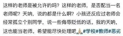 家长称该老师还存在孤立个别学生、发表侮辱贬低言论的行为,导致孩子出现厌学、看到老师就干呕出汗等心理应激反应。