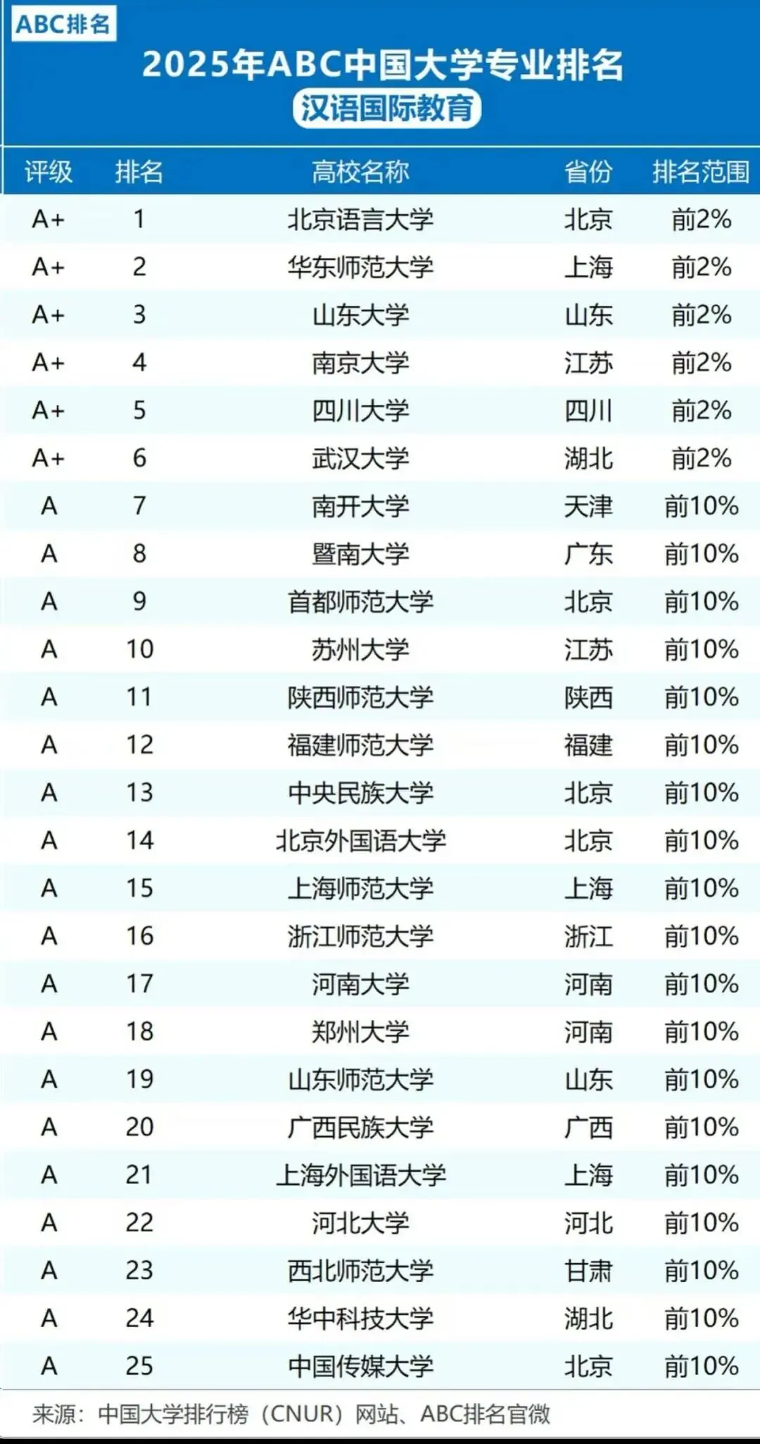 南京大学的汉硕专业隶属于其中国语言文学一级学科,该学科在多个权威排名中都位列前茅。在2025年ABC中国大学汉语国际教育专业大学排名,已于中国大学排行榜(CNUR)网站正式发布,该专业开设院校共320所,B类及以上高校共160所。排名结果显示,A类院校共32所,其中评级为A+等级共6所。南大就在其中,是汉语国际教育领域的“黄金第一梯队”