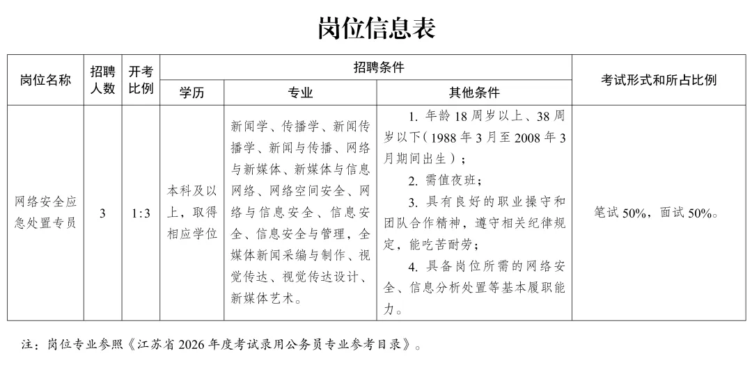 笔试方式为闭卷,考试内容主要考察招聘岗位所需要的网络安全、新闻传播等专业知识和综合素质、履职能力等;