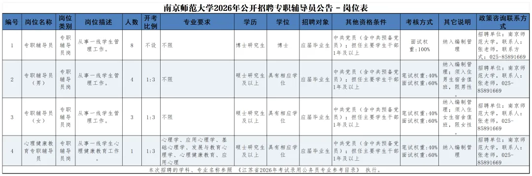 南京师范大学2026年公开招聘专职辅导员公告-岗位表