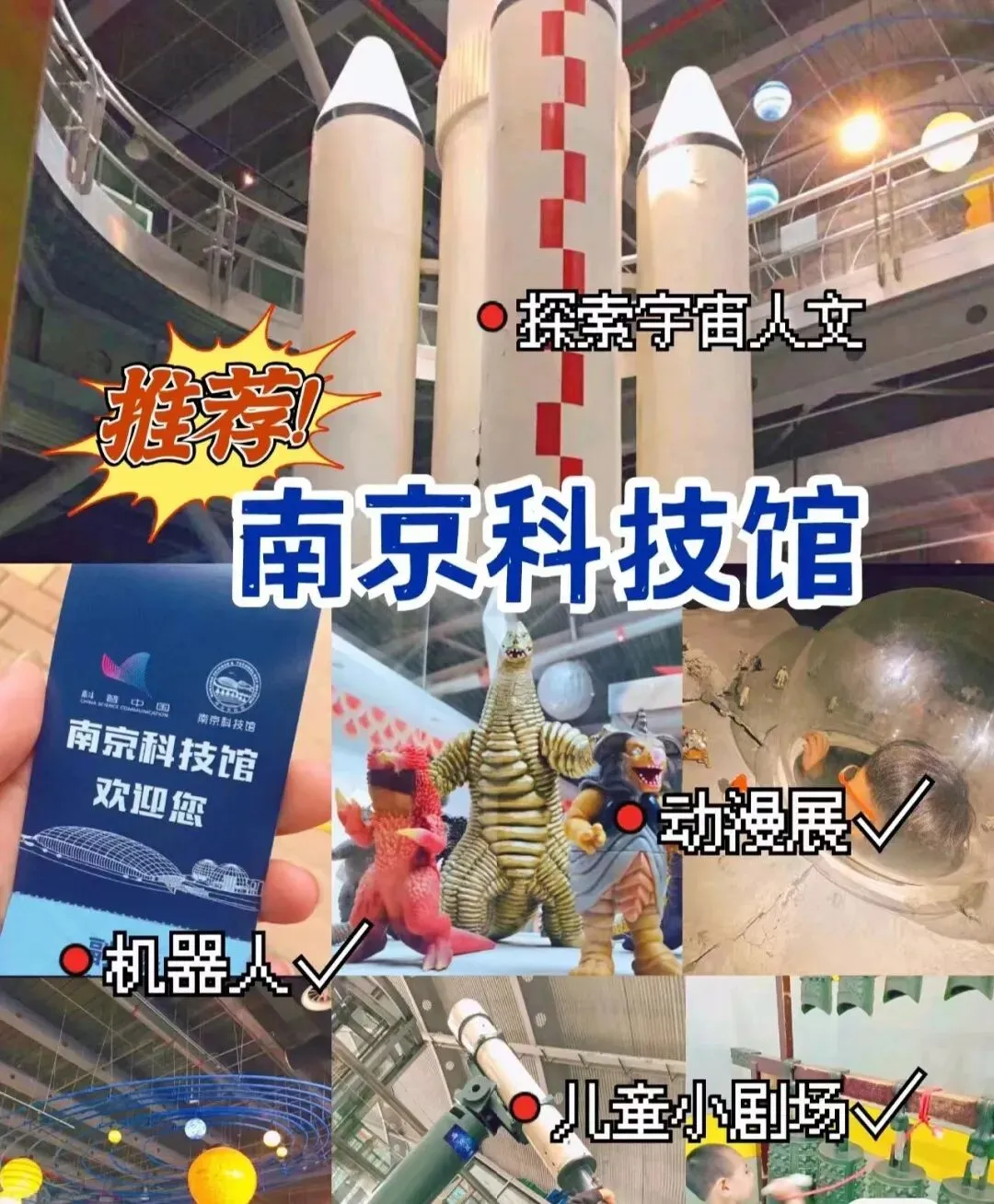 南京科技馆包括科技馆主场馆、科技影院及其它相关配套设施。主场馆由常设展厅、非常设展厅、国际会议交流报告厅等组成。其中常设展厅按主题划分为宇宙探秘、地球万象、智慧主人、创造天地、知识海洋和儿童科技乐园等六个展区。展品总计 350 多件,其中 70%以上的展品是参与性项目。