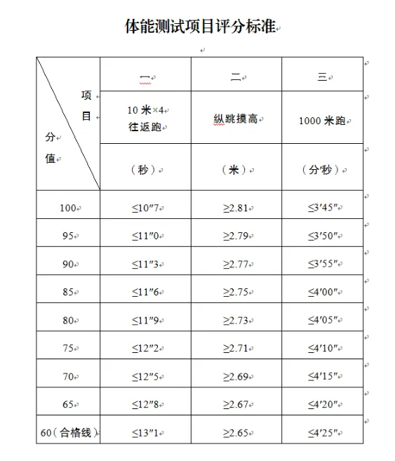 通过资格初审的人员,进入体能测试环节。体能测试参考公安机关录用人民警察体能测评项目和标准进行,测试项目包括:10米×4往返跑、纵跳摸高、1000米跑,根据各项目评分标准进行赋分(评分标准附后),三个项目得分的平均数为体能测试成绩(成绩保留至小数点后两位)。同时,每个项目设置合格线,任何一项不合格,即视为体能测试不合格。体能测试合格的人员中,根据体能测试成绩由高到低排序,按岗位招聘计划1:2的比例确定进入下一环节人员名单(体能测试成绩相同的一并进入下一环节)。