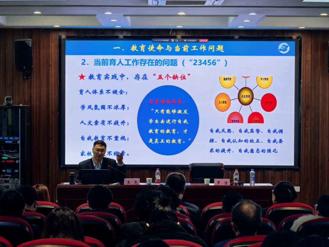 近日,学院特邀中国高教学会学生工作研究会副理事长,南京信息工程大学原党委副书记、副校长王尧教授在创新楼103作“构建三全育人体系,培养创新素质人才”专题培训讲座。讲座由学院党委委员、副院长罗浩主持,学生工作处、人事处、宣传部、教务处、团委、保卫处等部门负责人、工作人员,各二级分院院长、书记、副书记,全体学工组长、团总支书记、辅导员及相关班主任参加了讲座。王尧教授紧扣新时代教育的初心与使命,结合自身深耕高校育人工作的丰富经验,将理论阐释与案例剖析有机融合,重点讲述了“教育使命与当前工作存在的问题”及“构建大体系提升育人实效”等方面内容,针对学生教育管理中的痛点、难点与堵点及其成因,提出做好立德树人工作,要从宏观、中观、微观三个方面一起用力,切实增强高校思政工作的“实感”、“力感”、“手感”,并用实际案例和工作体会分享了若干解决问题的有效措施与方法,勉励辅导员、班主任等一线学工人员修炼“五有”——有理念、有担当、有真情、有方法、有研究,弘扬教育家精神,加强学生思想教育与价值引领,把论文写在学生成长的路上。罗浩作总结讲话。他表示,王尧教授的讲座主题鲜明、详细全面,既有理论深度,又有实践力度,对推进学生工作具有很强的指导性和可操作性。他要求,下一步学生工作处要持续推进辅导员班主任聚力赋能,完善分层分类、形式多样的培训体系,着力打造一支政治坚定,作风优良的辅导员队伍。