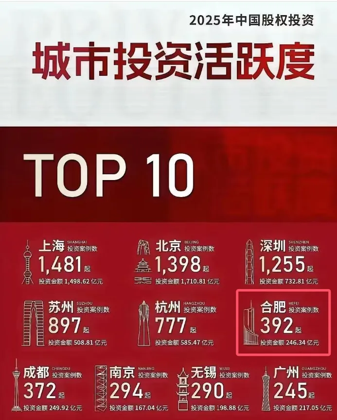 合肥跻身城市投资活跃度TOP10,整体排名超越成都,南京等城市!