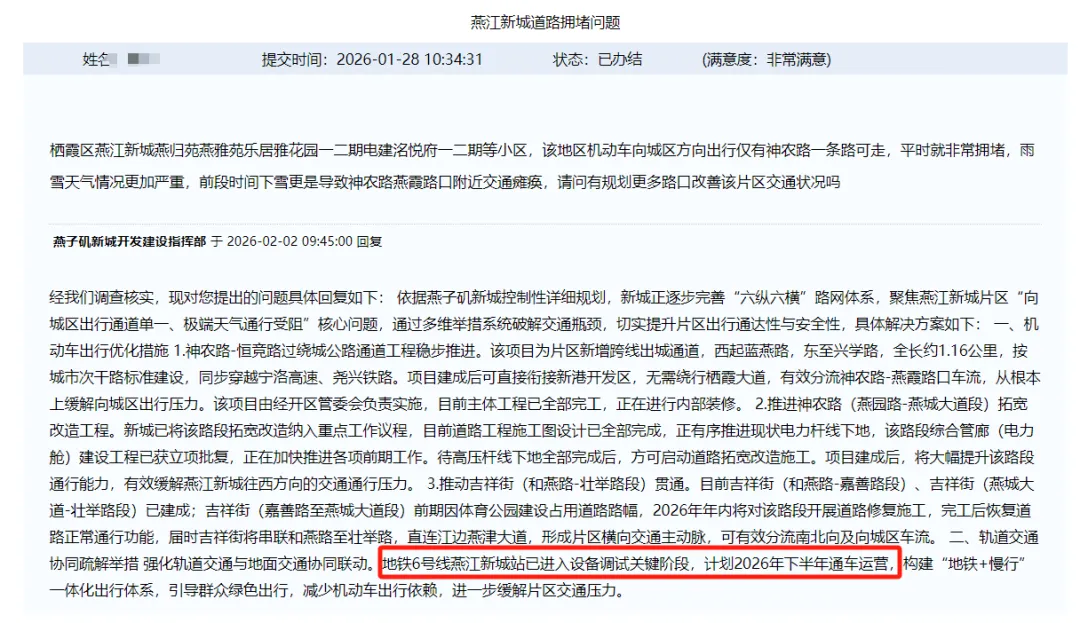据燕子矶新城开发建设指挥部近期回复:“地铁6号线燕江新城站计划2026年下半年通车运营。”