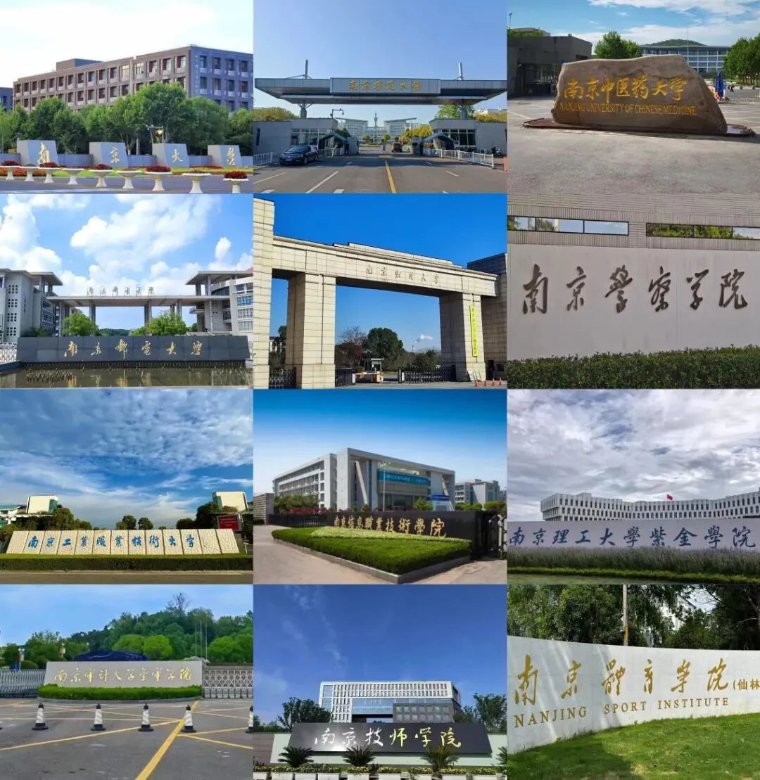 南京大学、南京师范大学、南京中医药大学、南京邮电大学、南京财经大学、南京警察学院、南京工业职业技术大学、南京信息职业技术学院、南京理工大学紫金学院、南京审计大学金审学院、南京技师学院、南京体育学院