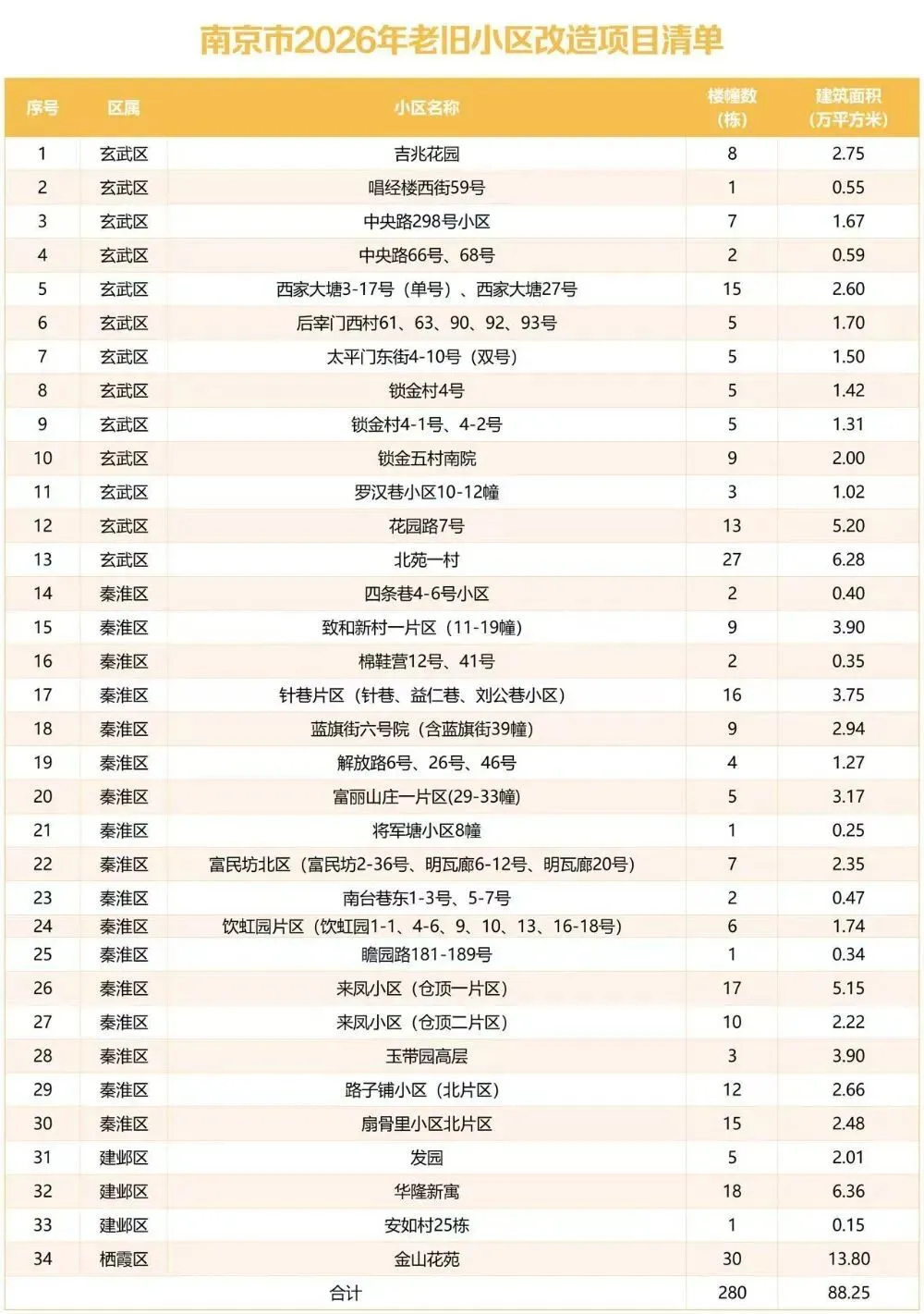今年,南京市有34个老旧小区纳入改造清单,涉及玄武区13个、秦淮区17个、建邺区3个以及栖霞区1个,共计280栋建筑,总建面约88.25万平方米。