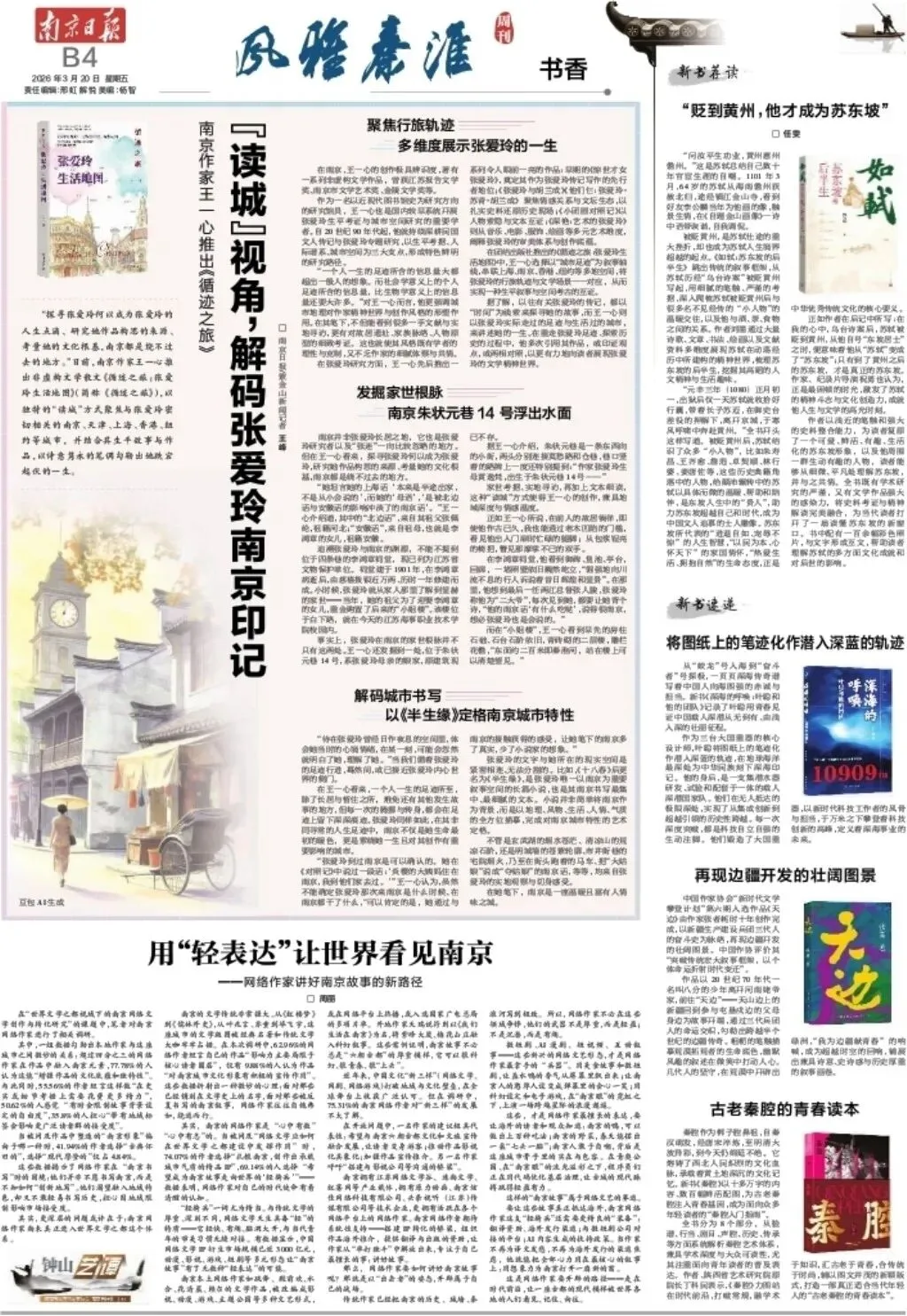 近日,《南京日报》刊发南京日报/紫金山新闻记者王峰撰写的推荐文章《“读城”视角,解码张爱玲南京印记》。文章梳理了作家王一心研究张爱玲的创作脉络,深入解读张爱玲及其作品与南京的深厚渊源。