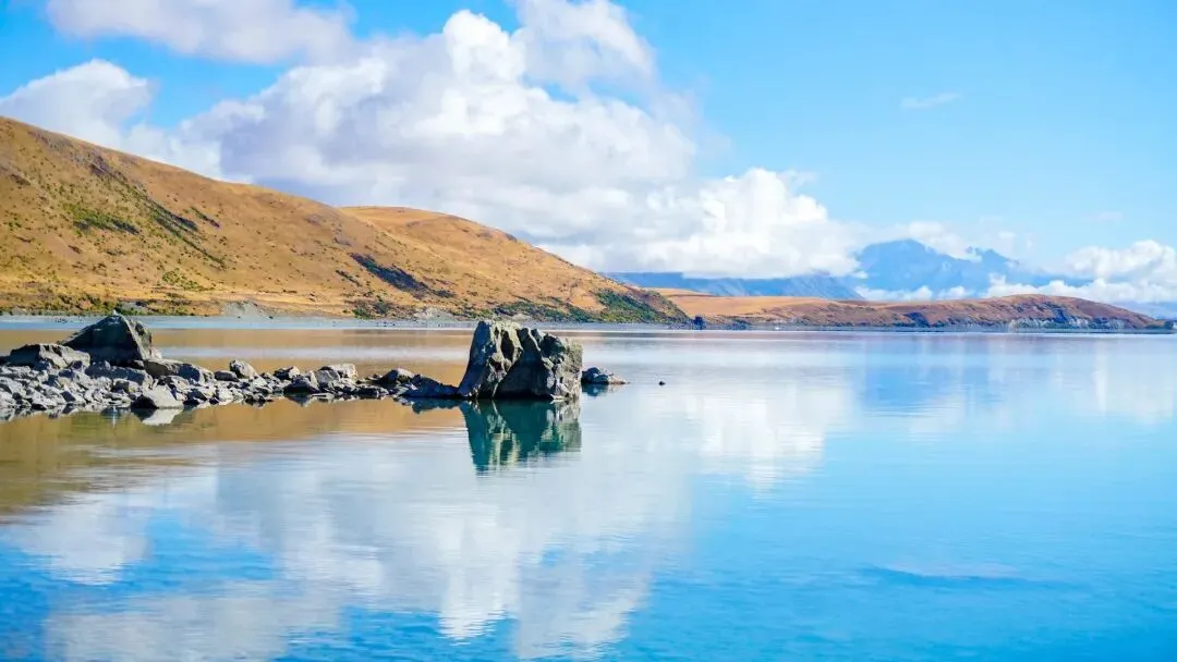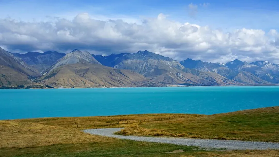 沿着8号景观公路来到海拔971公尺的林地斯隘口,【普卡基湖Lake Pukaki】(游览约30分钟),蓝色湖水中映入梦幻色彩,称为「土耳其蓝色湖」─冰河遗留下的冰碛石堆积所形成的偃塞湖,水源来自塔斯曼等数条冰河融化后所形成的塔斯曼河。冰河夹带的粉末杂质,将湖水调成有如加了浓浓牛奶的蓝绿梦幻色彩,终年积雪的山脉环绕,营造出有如香格里拉般的仙境世界,成为魔戒电影中迷人的拍摄场景。