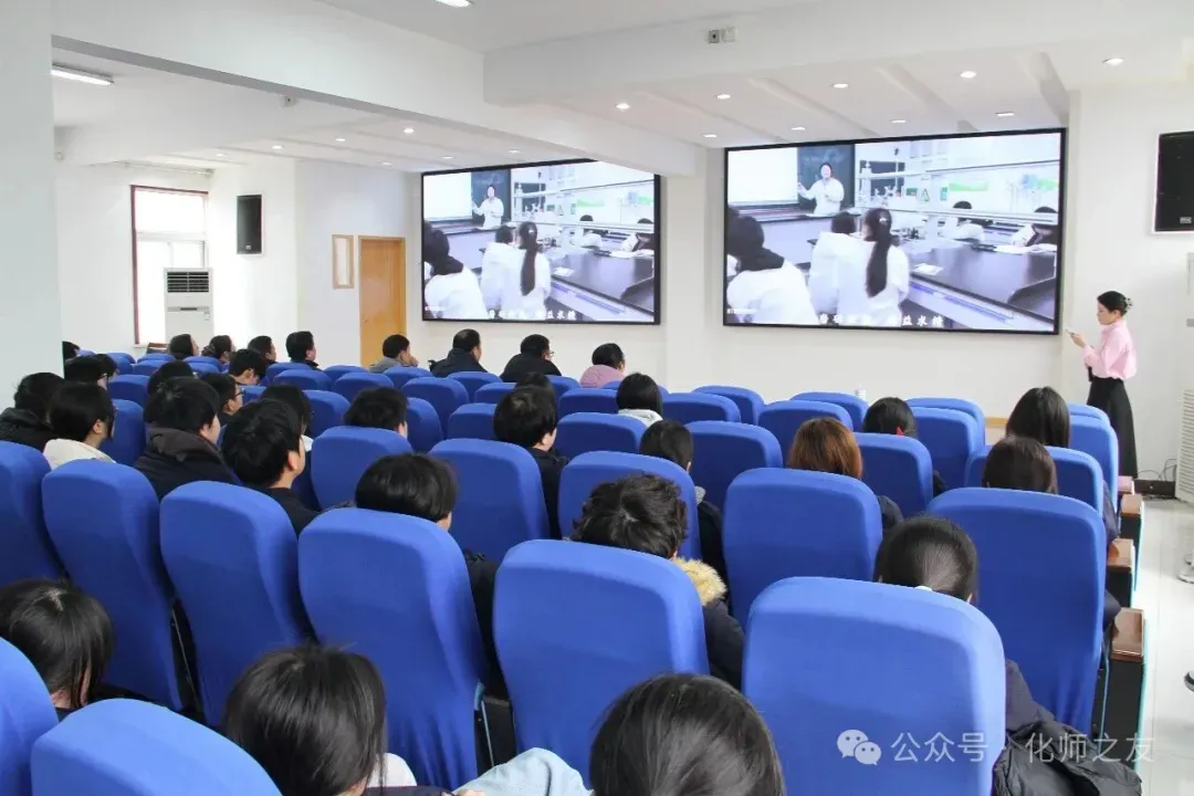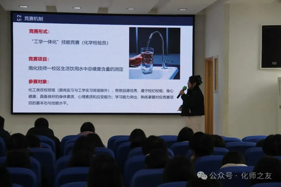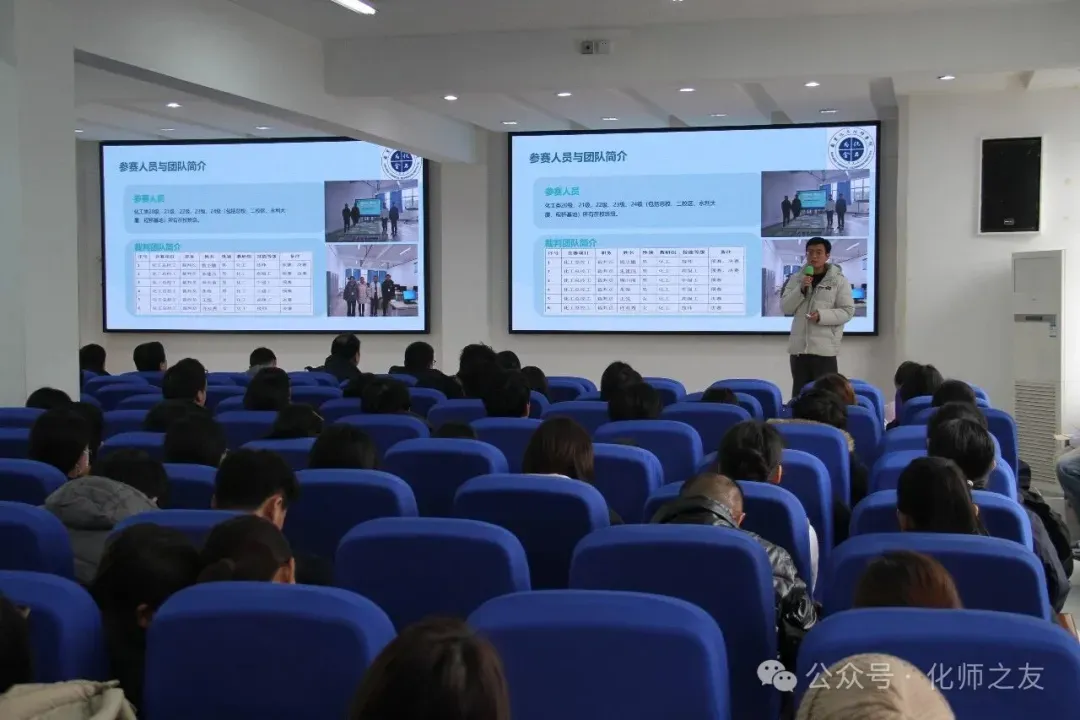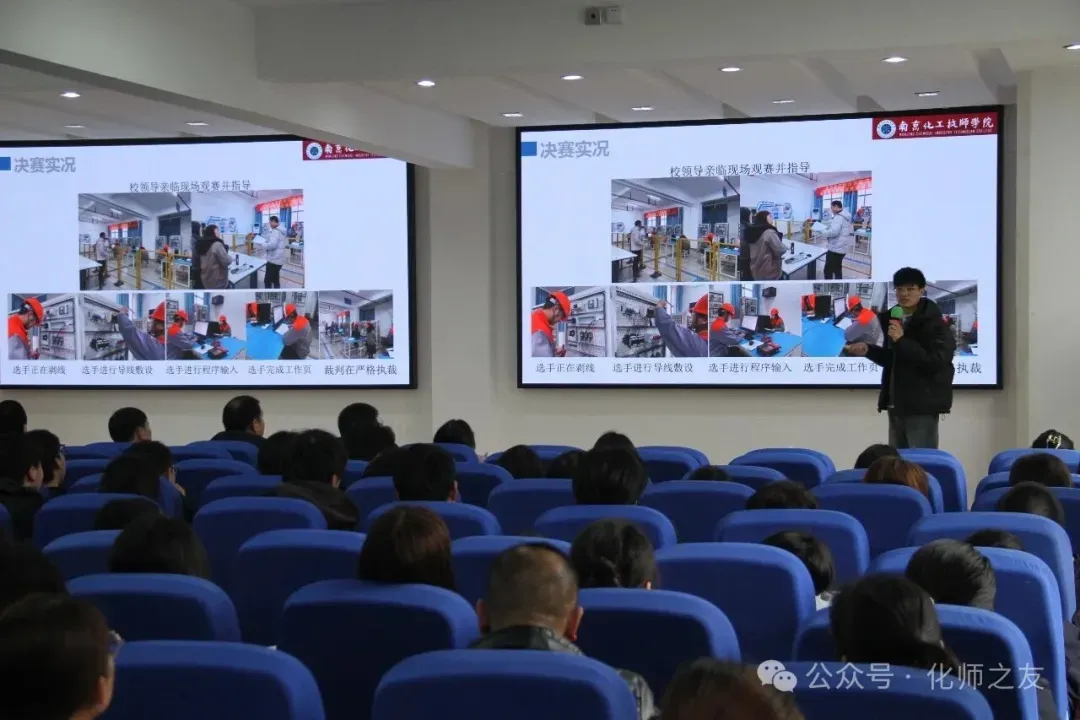 在赛事汇报环节,张艾彩珺、朱建风、万春红、吴志鹏、郭其平五位老师代表,分别围绕水质检测、甲醇生产装置操作、数控编程与加工、电气设备安装调试、创意短视频五个项目进行成果展示,展现了专业教学与生产实践的深度融合。