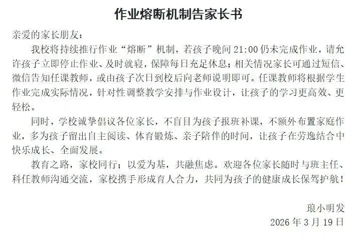 琅小明发给家长发的通知里称,若孩子晚间21:00仍未完成作业,请允许孩子立即停止作业、及时就寝,保障每日充足休息;相关情况家长可通过短信、微信告知任课教师,或由孩子次日到校后向老师说明即可。任课教师将根据学生作业完成实际情况,针对性调整教学安排与作业设计,让孩子的学习更高效、更轻松。