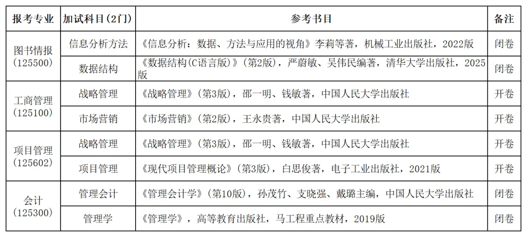 (1)笔试:笔试满分为100分,考试时间2小时。考核内容与《2026年攻读硕士学位研究生招生专业目录》中公布的复试笔试科目范围一致。参加管理科学与工程(120100)笔试的考生,需要携带无存储功能的计算器;工商管理(125100)和工程管理(项目管理125602)笔试科目为《管理学》,开卷考试,可查阅纸质材料,不需要使用计算器。