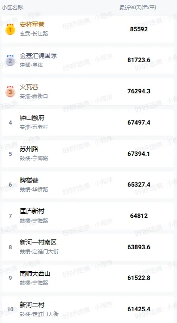 看下过去90天南京二手房成交单价前10名单: