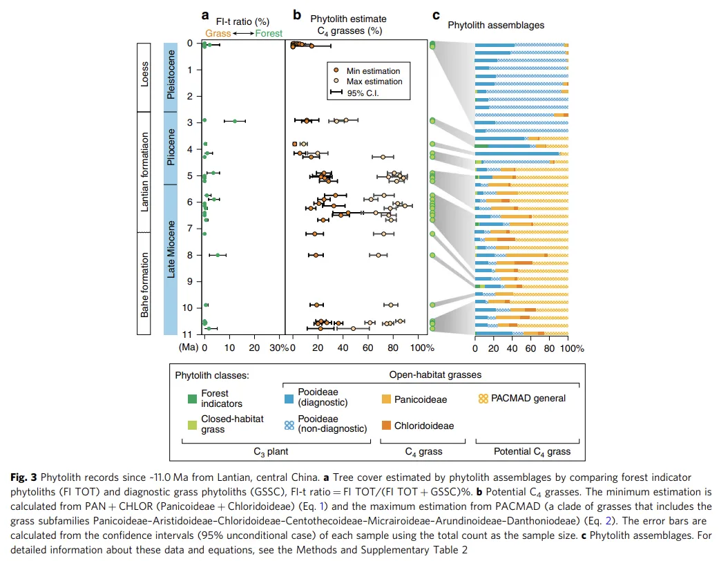 - 约11.0至4.2 Ma前(晚中新世至早上新世):植被由C3和C4植物混合的草原主导,而非密闭森林。C4植物非常丰富(最小值估算平均~25%,最大值估算平均~75%),主要由适应温暖潮湿气候的PACMAD类(以黍亚科为主)占优势。