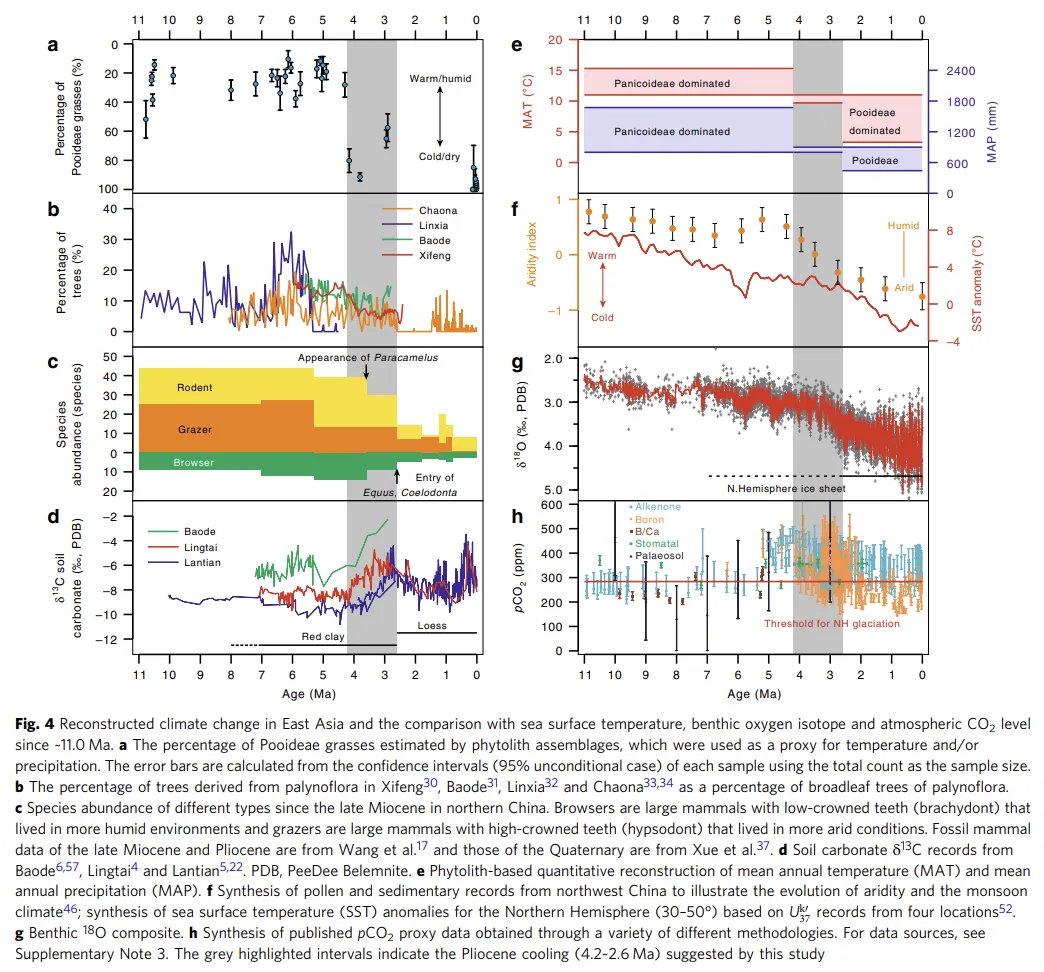 - 与其他记录的对比:本研究重建的温度和降水序列(尤其是约4.2 Ma的转折)与多项独立记录高度一致,包括黄土高原、临夏盆地、朝那等地的孢粉记录、哺乳动物化石丰度及物种组成变化(如喜湿润的Browser减少,喜干燥的Grazer增多)以及土壤碳酸盐δ13C值的正向偏移等。