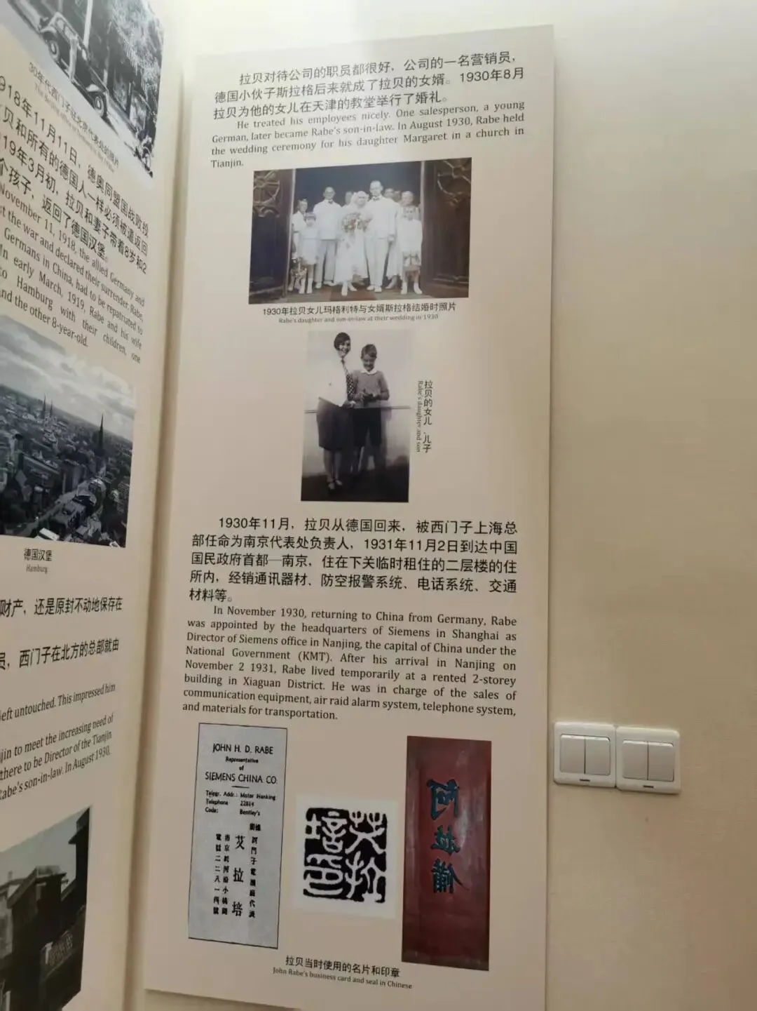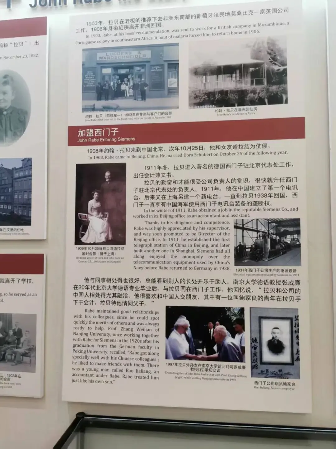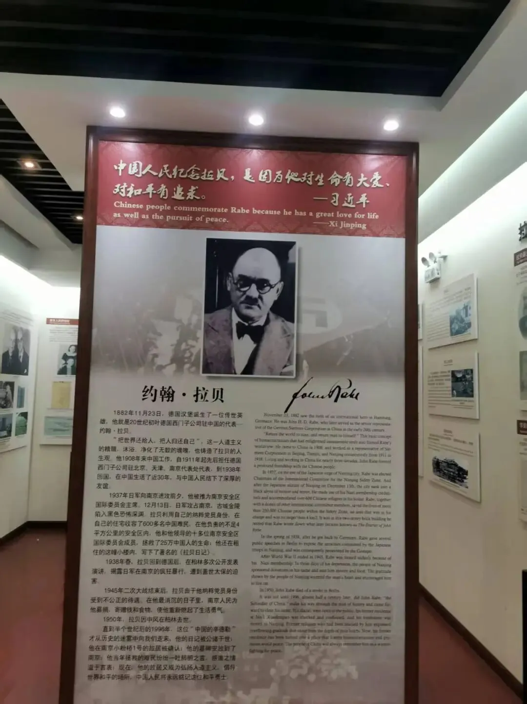 约翰·拉贝于1882年11月23日出生,1908年8月18日到达中国,先后在德国西门子驻北京分公司、南京分公司工作。1937年11月,发起并成立南京国际安全区并担任主席,以其在1937年—1938年的南京大屠杀期间的人道主义行为、以及作为南京大屠杀证据的《拉贝日记》而著名。第二次世界大战结束后,拉贝因曾是纳粹党员而先后被苏联和英国逮捕。鉴于在南京时的功绩,得到国民政府每月金钱和粮食接济。1950年1月5日在德国因中风去世。